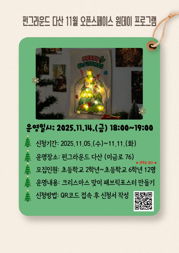 안녕하세요 펀그라운드 다산입니다. 청소년들의 다양한 체험활동 증진을 위한 패브릭포스터 만들기 프로그램을 운영합니다. [패브릭 포스터 만들기] - 신청기간: 2025.11.05.(수)~11.11.(화) - 운영일시: 2025.11.14.(금) 18:00~19:00 - 운영장소: 펀그라운드 다산(미금로 76) - 모집인원: 초등학교 2학년~초등학교 6학년 12명 (선착순 접수) - 운영내용: 크리스마스 맞이 패브릭 포스터 만들기 - 신청방법: QR코드 접속 후 신청서 작성 문의전화 031-560-1508 |