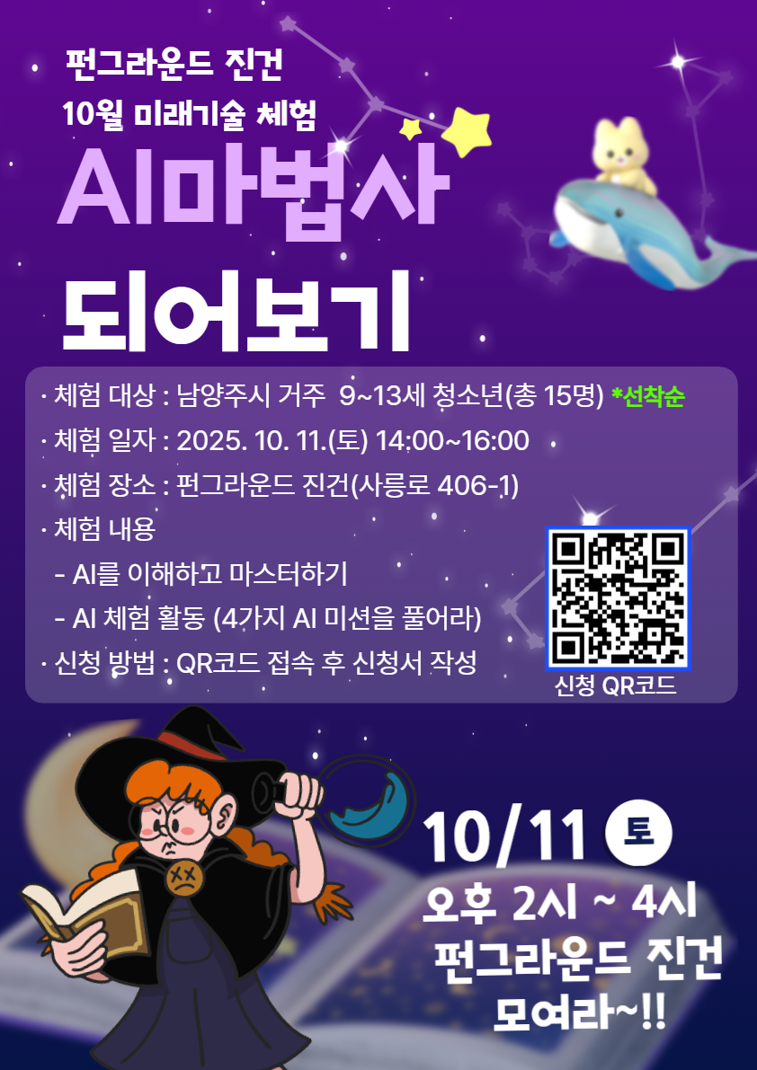 펀그라운드 진건 10월 미래기술 'AI 마법사 되어보기' 대상: 남양주시 거주 9~13세 청소년(총 15명) *선착순 일자: 25. 10. 11.(토) 14:00~16:00 장소: 펀그라운드 진건(사릉로 406-1) 내용: AI를 이해하고 마스터하기, AI체험 활동(4가지 AI 미션을 풀어라) 준비물: 개인 태블릿 PC 신청방법: QR코드 접속 후 신청서 작성 |