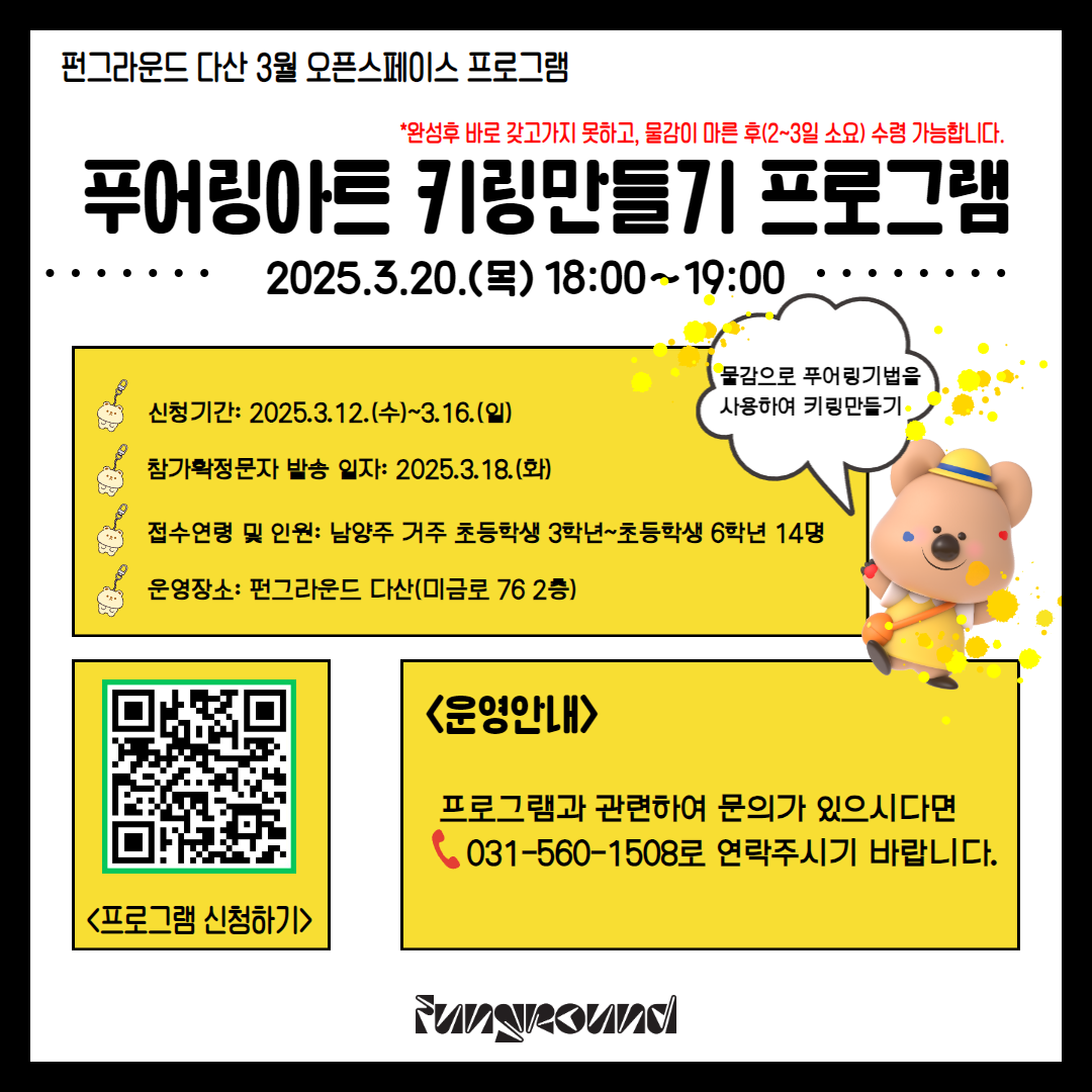 안녕하세요 펀그라운드 다산입니다! 3월 오픈스페이스 원데이 프로그램인 "푸어링아트 키링 만들기"를 운영합니다! *본 프로그램은 물감을 활용한 프로그램이므로, 당일에 바로 갖고가지 못하고, 물감이 모두 마른후(2~3일 소요) 수령 가능합니다. [푸어링아트 키링만들기] - 운영일시: 2025.3.20.(목) 18:00~19:00 - 접수기간: 2025.3.12.(수)~3.16.(일) - 확정문자발송일자: 2025.3.18.(화) - 운영장소: 펀그라운드 다산(미금로 76) - 모집연령: "남양주 거주" 초등학교 3학년~초등학교 6학년 - 활동내용: 푸어링기법을 활용한 키링 만들기 프로그램 -준비물: 앞치마, 팔토시 (펀그라운드에서 별도로 제공이 어렵습니다..) **신청방법 QR코드 혹은 아래 신청링크로 신청서를 작성해주시면 됩니다! 본 프로그램은 준비물이 인원 수 만큼 준비되기 때문에 참석이 가능한 청소년들만 신청해주시기 바랍니다! 문의사항: 031-560-1508 |