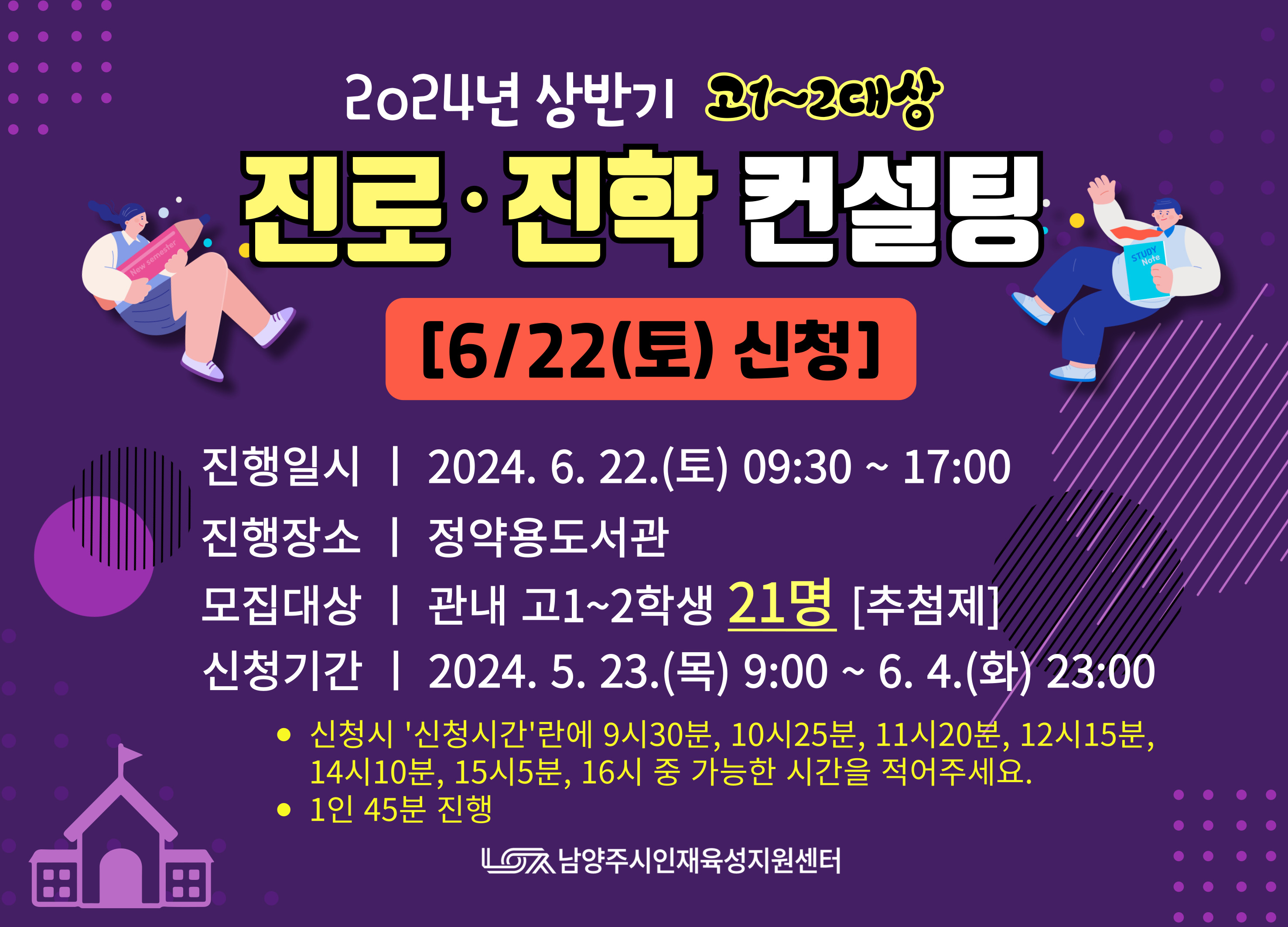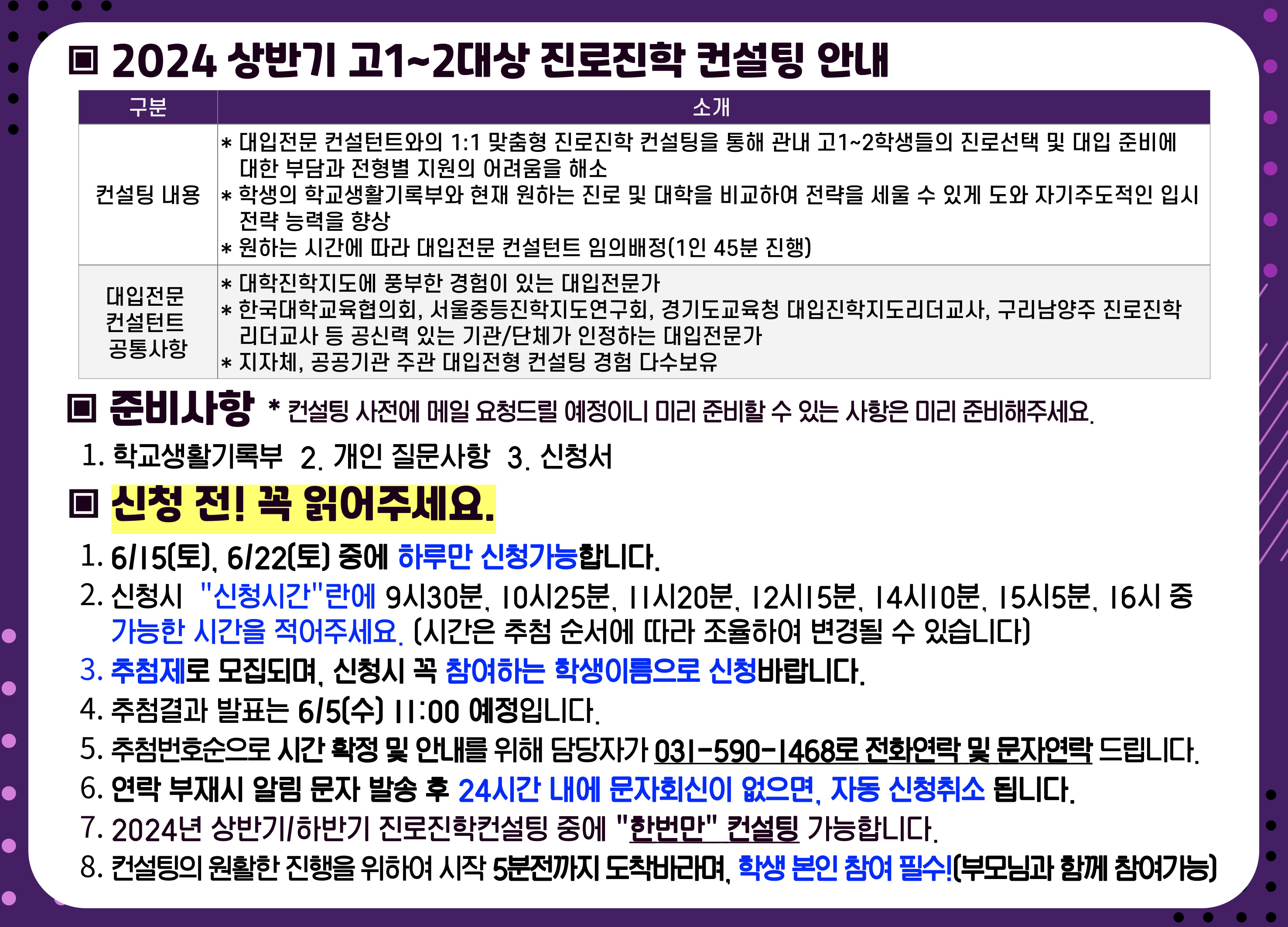 | 준비물 | 학교생활기록부, 질문사항, 신청서 (추후 메일로 안내) |