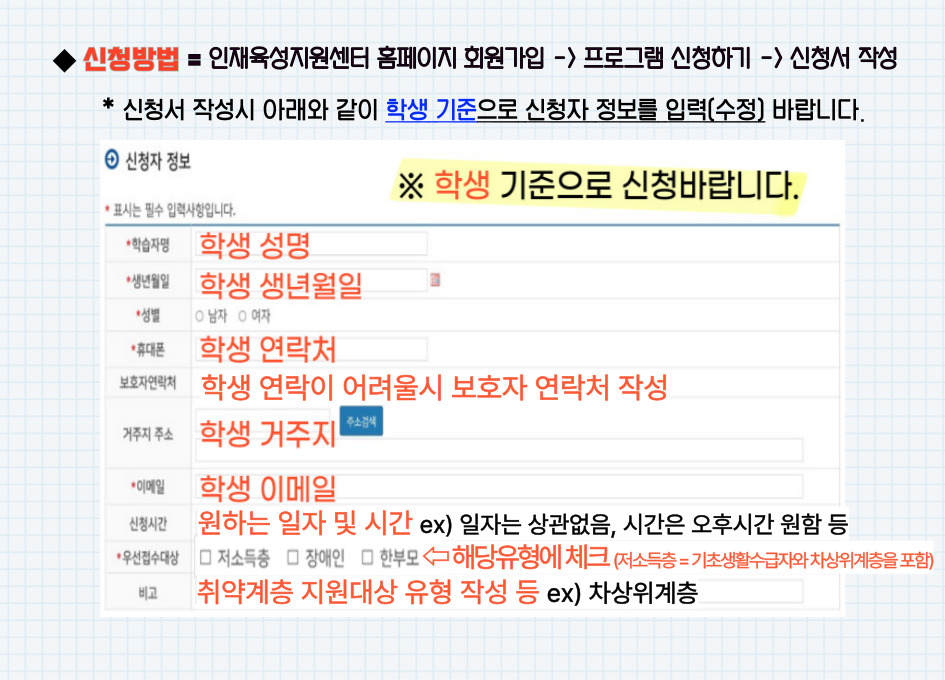 취약계층증빙서류, 학교생활기록부, 질문사항, 신청서 (추후 메일로 안내) |