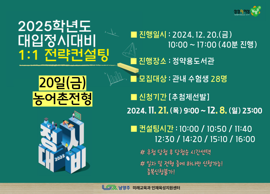 | 프로그램명 | [12/20(금) 농어촌전형] 2025학년도 대입정시대비 1:1 전략컨설팅 |