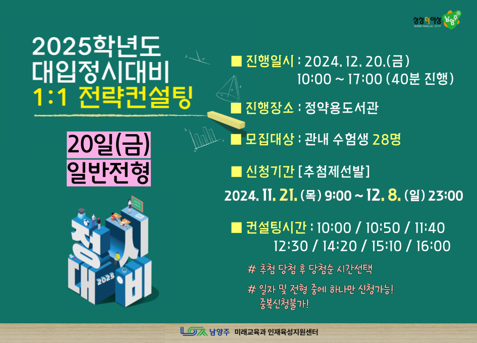 | 프로그램명 | [12/20(금) 일반전형] 2025학년도 대입정시대비 1:1 전략컨설팅 |