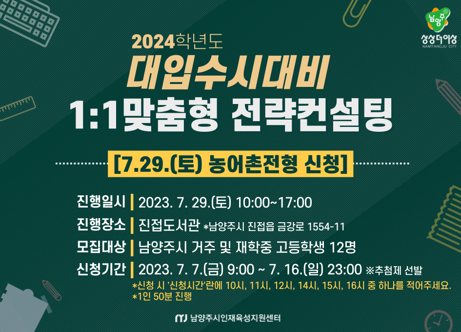 | 프로그램명 | (농어촌전형신청 7/29(토)) 대입수시대비 1:1 맞춤형 전략컨설팅_진접읍 |
