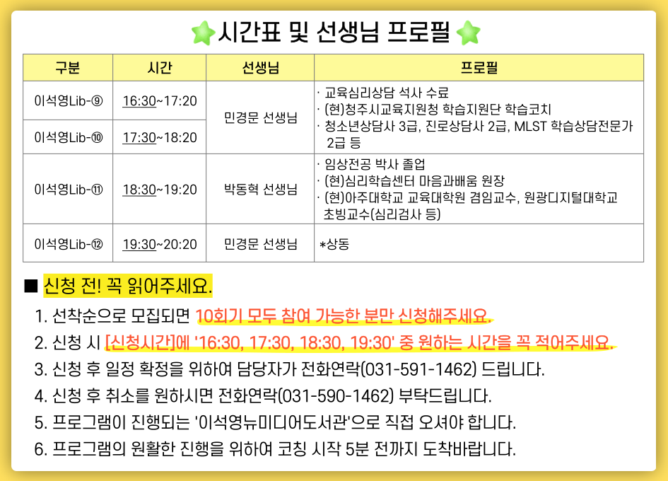 ⑨16:30~17:20, ⑩17:30~18:20, ⑪18:30~19:20, ⑫19:30~20:20 중 택1 |