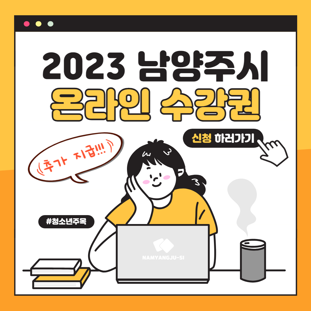 [강남인강 인터넷 강의 수강권 추가지급] ○ 신청기간: 23.06.28.(수) 09:00 ~ 수강권 소진 시까지 ○ 모집인원: 580명 (선착순!) ○ 지급대상: 우리시 학교 밖 청소년을 포함한 14~19세 청소년(학교 기준 중1~고3) ○ 지급일정: 신청 후 2~3주 이후 지급(내부사정에 의해 변경될 수 있습니다.) ○ 지급방법: 신청 시 입력한 전화번호로 수강권 SMS 발송 ○ 지급내용: 강남인강 인터넷 강의 수강권(중·고등부 과정 전과목 강의 수강 1년) ○ 기타문의: 031-590-1498(남양주시청 미래교육과) ※ 중복지급 및 부정수급 시도 적발시 선정 인원에서 제외됩니다. ※ 사전에 회원가입을 하셔야만 신청이 가능합니다! ※ 예비 신청의 경우 신청 취소 건이 발생한 경우 공원을 보충하기 위한 신청이므로 공원이 발생하지 않는 경우 지급이 불가할 수 있음을 알려드립니다. ※ 23. 7. 3. 일자로 SMS를 통해 수강권 지급이 완료되었습니다. 수강권 관련 SMS를 받지 못하셨다면 위 연락처로 문의하시어 수강권 재발급 신청을 해주시기 바랍니다. 감사합니다. |