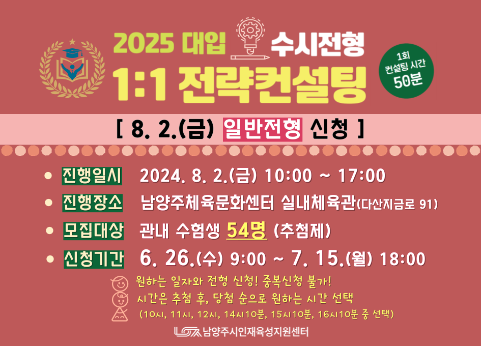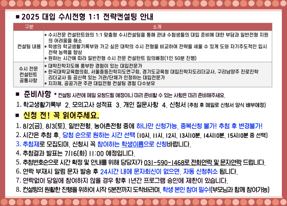 | 프로그램명 | [8/2(금) 일반전형 신청] 2025대입 수시전형 1:1 전략컨설팅 |