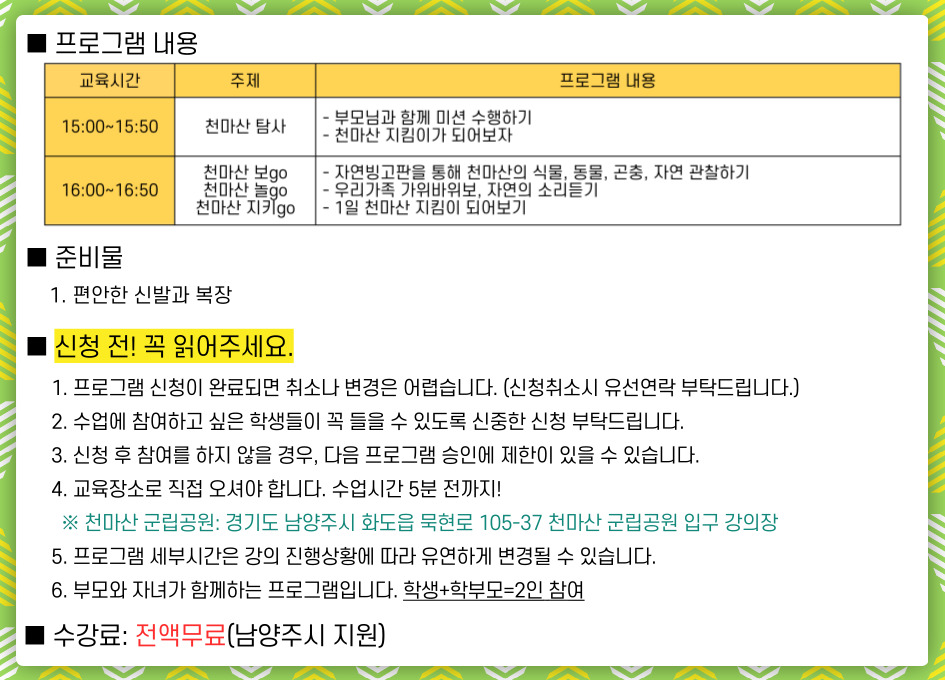 프로그램명 (초등저학년진로) 나는야! 천마산 지킴이