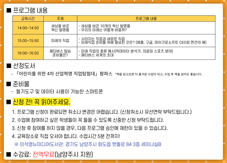 | 교육장소 | 이석영뉴미디어도서관 3층 세미나실B |