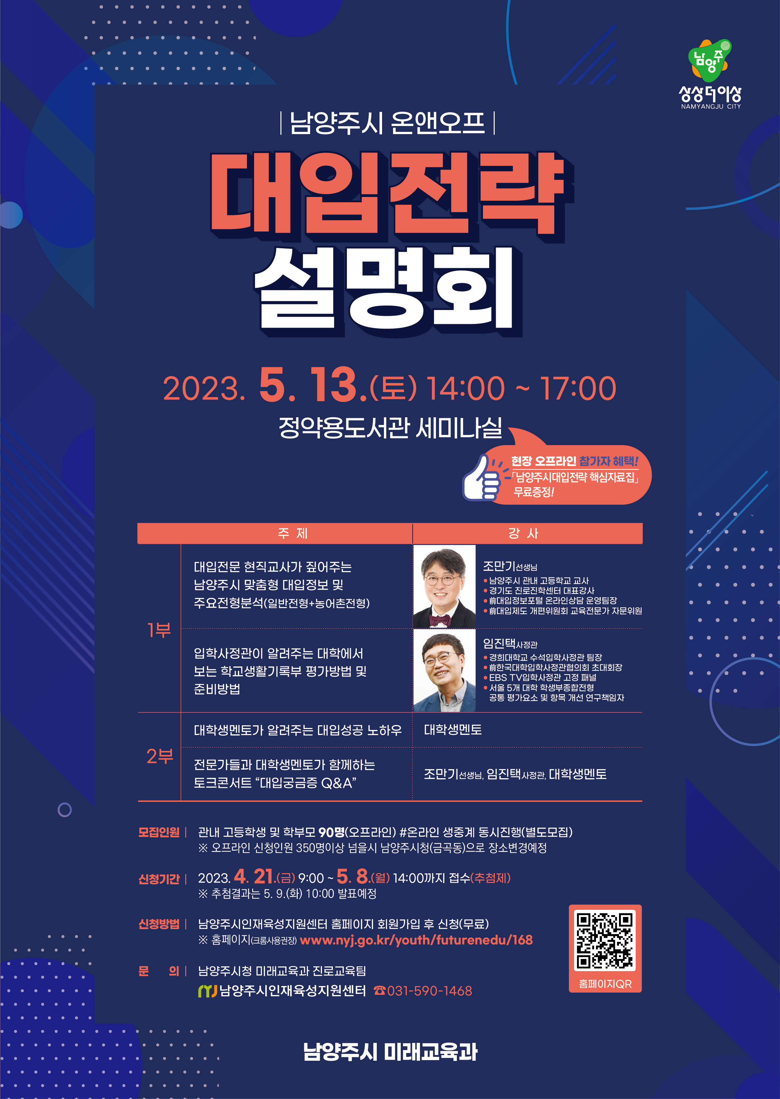 인재육성지원센터 [인재육성지원센터] 남양주시 온앤오프 대입전략 설명회 참가자 모집
