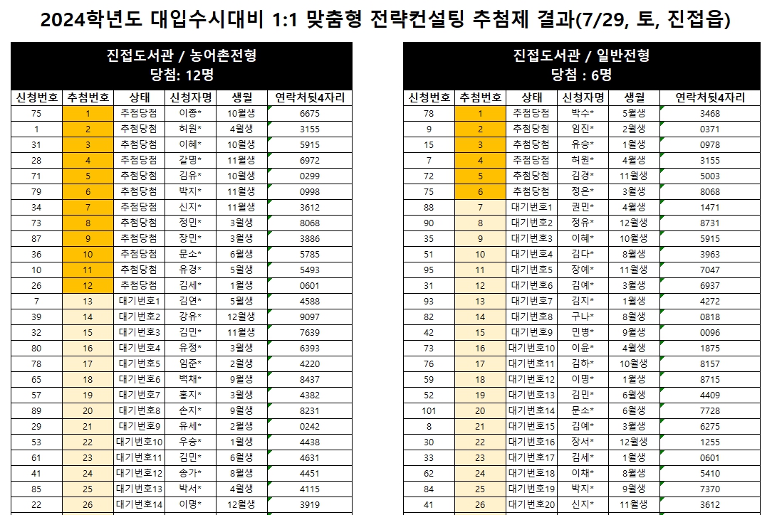인재육성지원센터 [인재육성지원센터] (7/29, 토, 진접읍) 2024 대입수시 대비 1:1 맞춤형 전략컨설팅 추첨제 결과안내