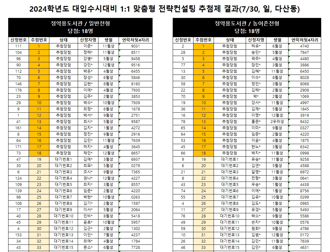 인재육성지원센터 [인재육성지원센터] (7/30, 일, 다산동) 2024 대입 수시대비 1:1 맞춤형 전략컨설팅 추첨제 결과안내