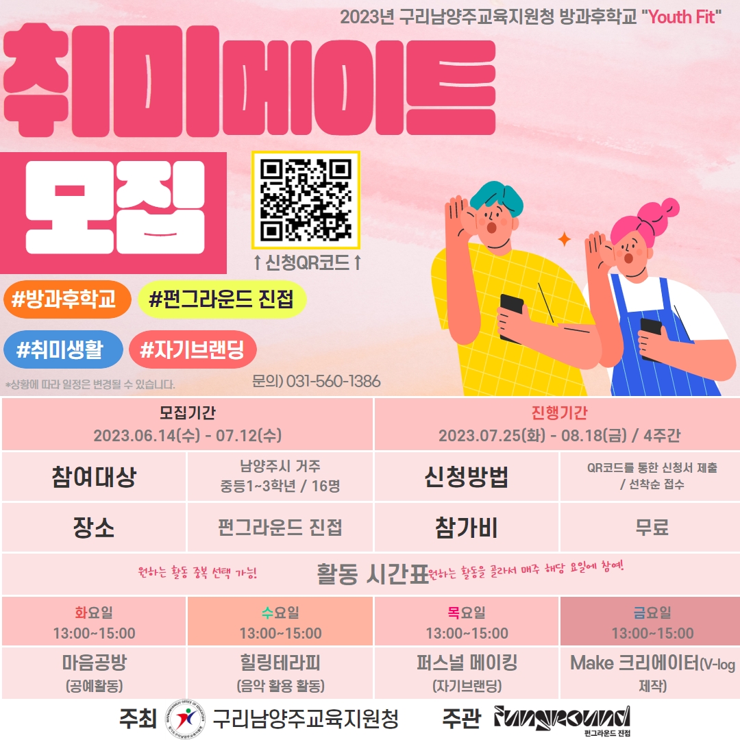 - 활동대상 : 남양주시 거주 또는 재학중인 14~16세 청소년 / 각 요일별 16명(중복신청 가능)
