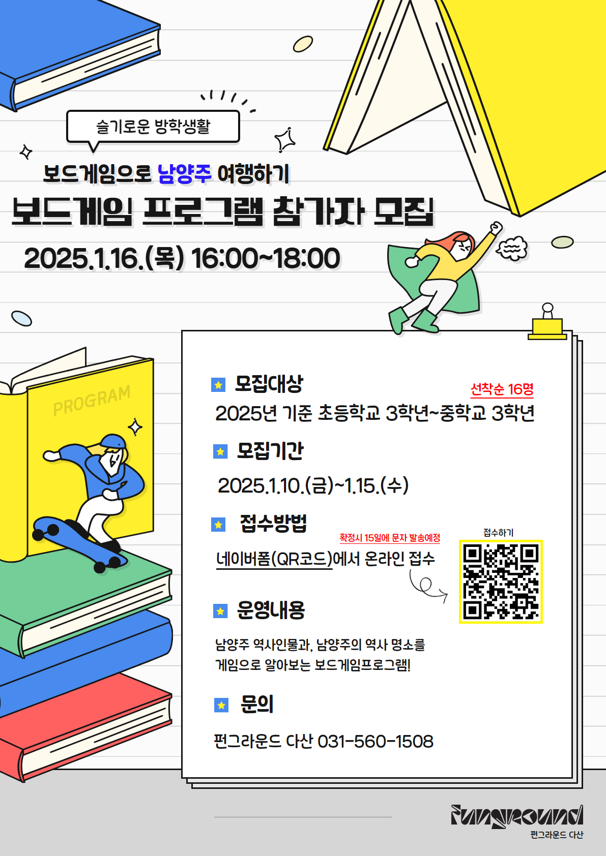 안녕하세요 펀그라운드 다산입니다! 길고 긴 겨울방학! 슬기롭게 방학을 보내는 방법은? 펀그라운드 다산에서 진행하는 프로그램 참여하기! 보드게임으로 남양주를 여행할 수 있는 프로그램 참가자를 모집합니다! [보드게임 프로그램 일정안내] * 신청기간: 2025.1.10(금)~1.15.(수) 선착순 마감(16명)시 모집 종료 * 일시: 2025.1.16.(목) 16:00~18:00 (2시간) * 모집연령: 남양주 거주 25년 기준 초등학교 3학년~중학교 3학년 * 활동장소: 펀그라운드 다산 * 활동내용: 즐겁게 보드게임으로 떠나는 남양주 트레블! <신청방법> * 신청방법은 QR코드와 첨부링크로 들어가셔서 네이버 폼 작성 부탁드립니다 |