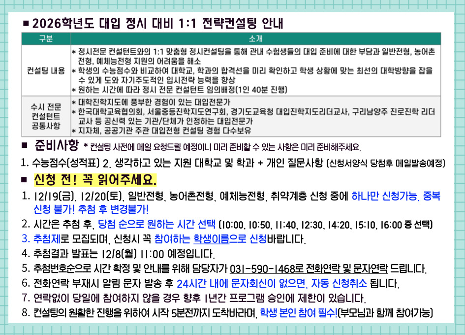 [12/19(금) 일반전형] 2026학년도 대입 정시 대비 1:1 전략컨설팅