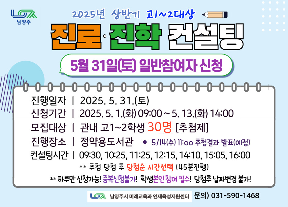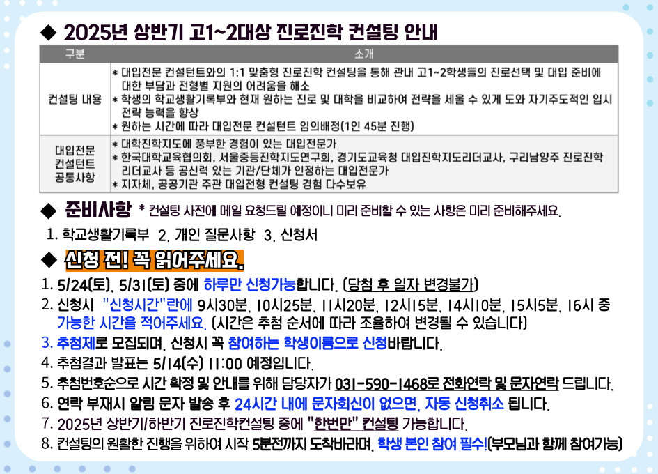 | 프로그램명 | [5/31(토)] 2025년 상반기 고1~2대상 진로진학 컨설팅 |