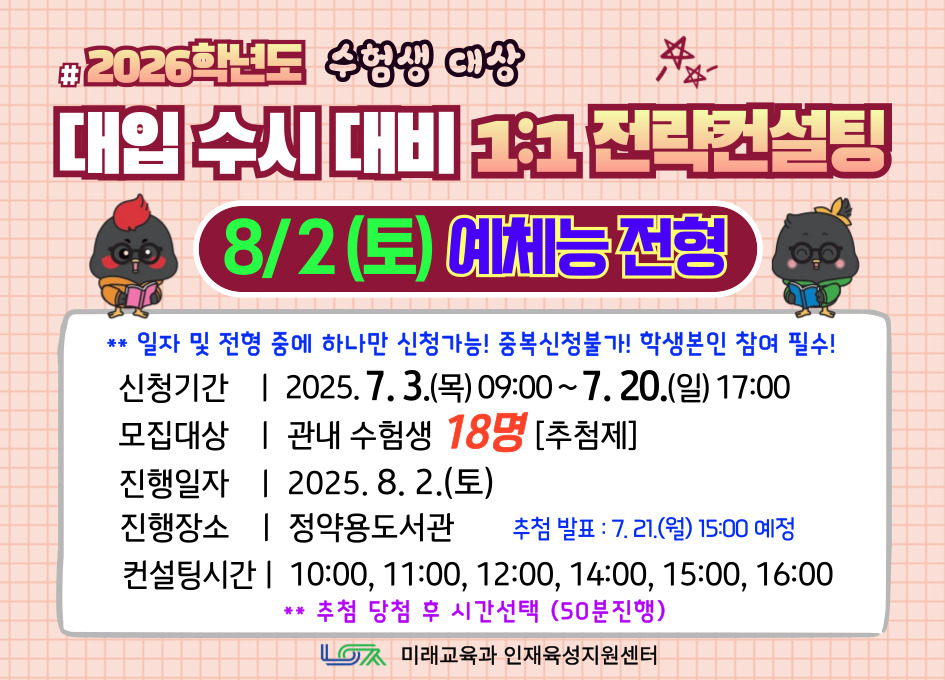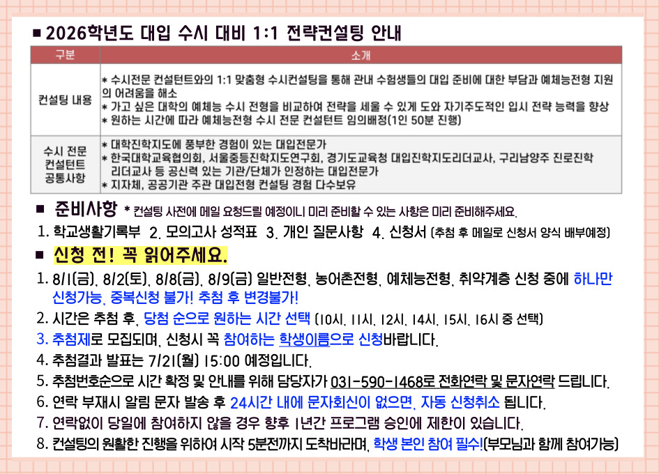 | 프로그램명 | [8/2(토) 예체능전형] 2026학년도 대입 수시 대비 1:1 전략컨설팅 |