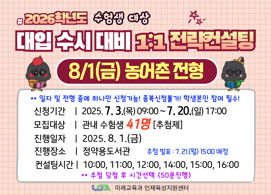 | 프로그램명 | [8/1(금) 농어촌전형] 2026학년도 대입 수시 대비 1:1 전략컨설팅 |