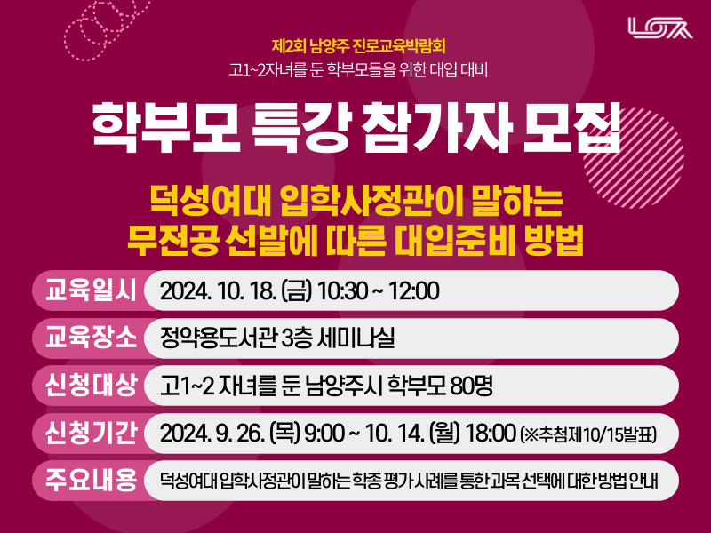 | 프로그램명 | (학부모)대입 대비 학부모 특강 : 덕성여자대학교 |