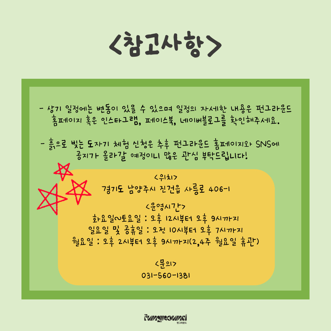 진건 [펀그라운드 진건] 6월 주요일정 안내 작성자 펀그라운드진건 등록일자 2023년 6월 7일 16시 55분 14초 조회 441 6월의 주요일정을 안내드립니다!6.3.(토) 청소년기획단 정기회의6.10.(토) 청소년운영위원회 정기회의6.14.(수) 진로특강 '요리사'6.16.(금) 학교연계 '환경교육'6.17.(토) 흙으로 빚는 도자기 체험6.22.(목) 학교연계 '미디어리터러시'6.24.(토) 컨셉데이 '포토데이' 001.jpg [ Size : 150.53KB, Down : 155 ] 미리보기 다운로드 002.jpg [ Size : 188.42KB, Down : 193 ] 미리보기 다운로드 목록보기