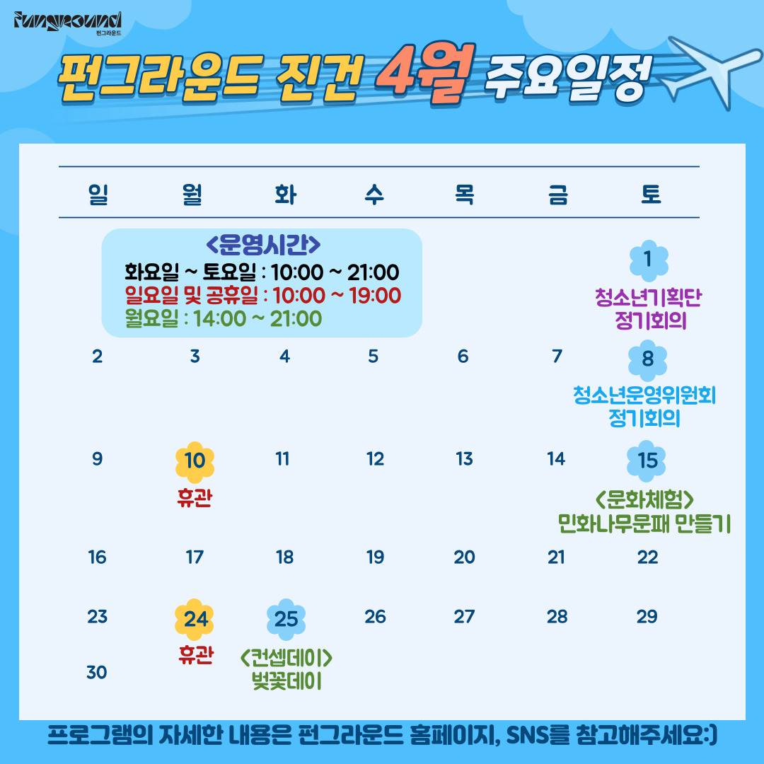 진건 [펀그라운드 진건] 4월 주요일정 안내 작성자 펀그라운드진건 등록일자 2023년 4월 6일 13시 33분 25초 조회 427 펀그라운드 진건의 4월 주요일정을 안내드립니다!4/1 청소년 기획단 정기회의4/2 청소년운영위원회 정기회의4/15 <문화체험> 민화나무문패 만들기4/25 <컨셉데이> 벚꽃데이※10일, 24일은 휴관입니다.※프로그램들의 자세한 내용은 펀그라운드 홈페이지, 인스타그램, 페이스북, 네이버 블로그를 참고해주세요~ 4월-주요일정-001.jpg [ Size : 230.81KB, Down : 249 ] 미리보기 다운로드 목록보기
