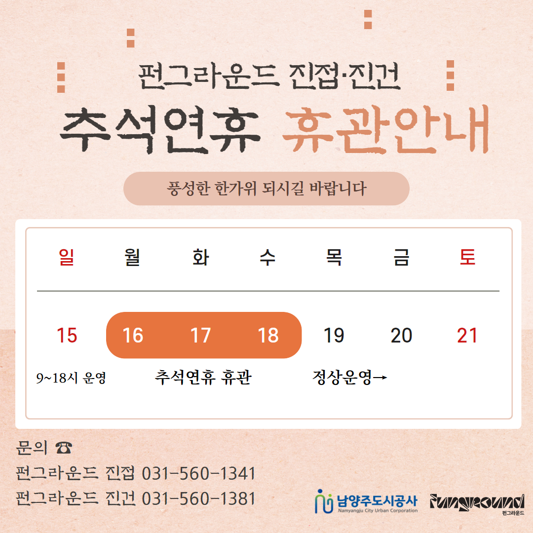 진건 [공지] 펀그라운드 진접·진건 추석연휴 휴관안내 작성자 펀그라운드진접 등록일자 2024년 9월 13일 13시 54분 38초 조회 258 제목을 입력하세요 (15).jpg [ Size : 1017.19KB, Down : 106 ] 미리보기 다운로드 목록보기