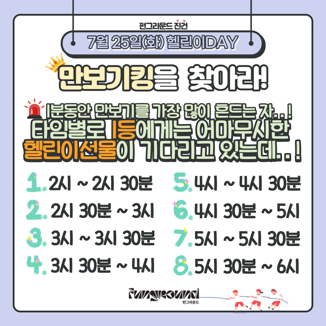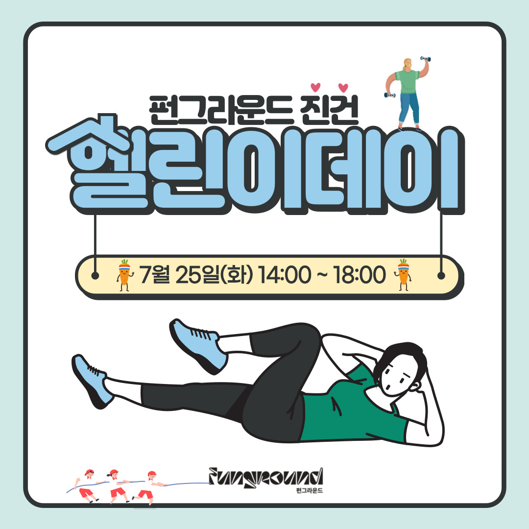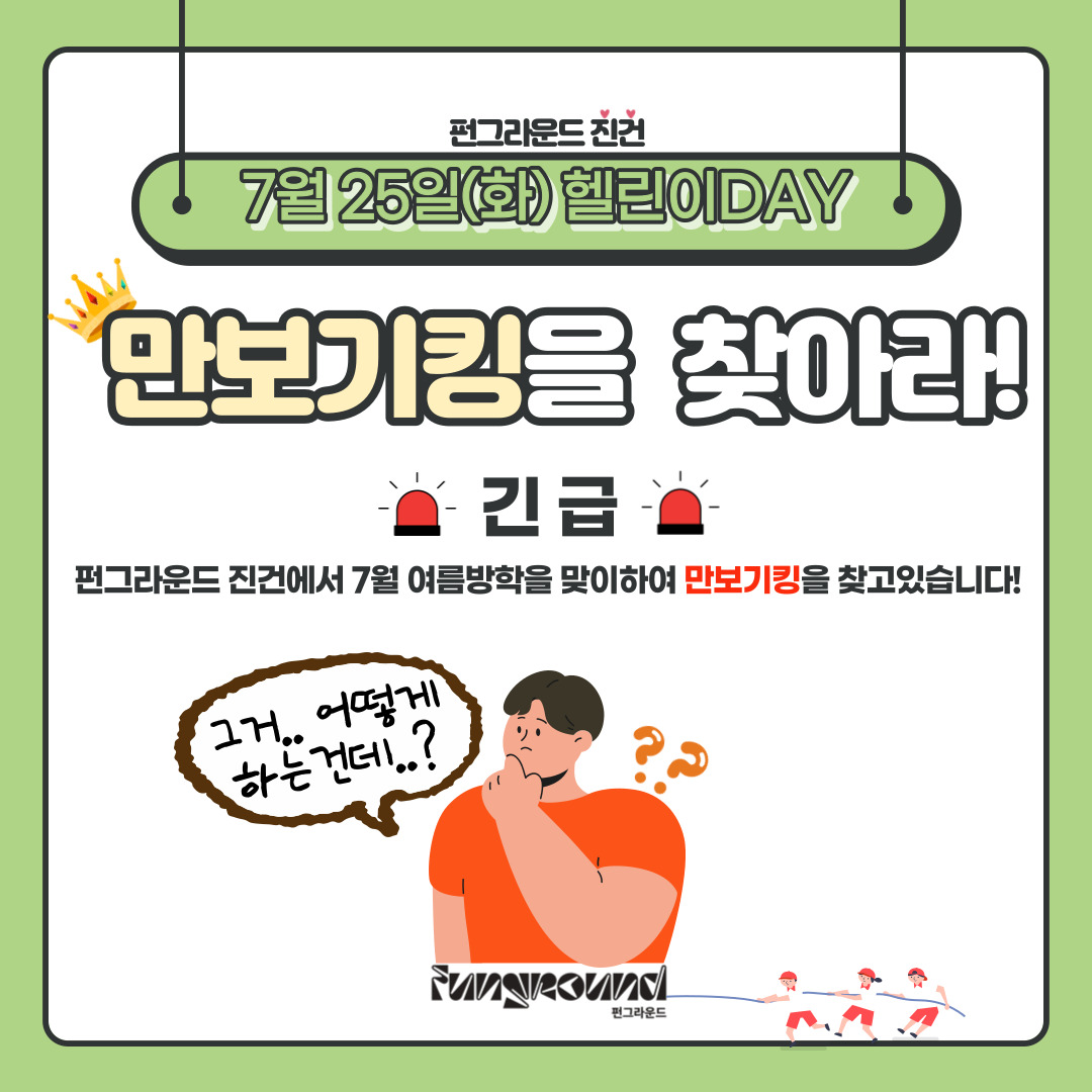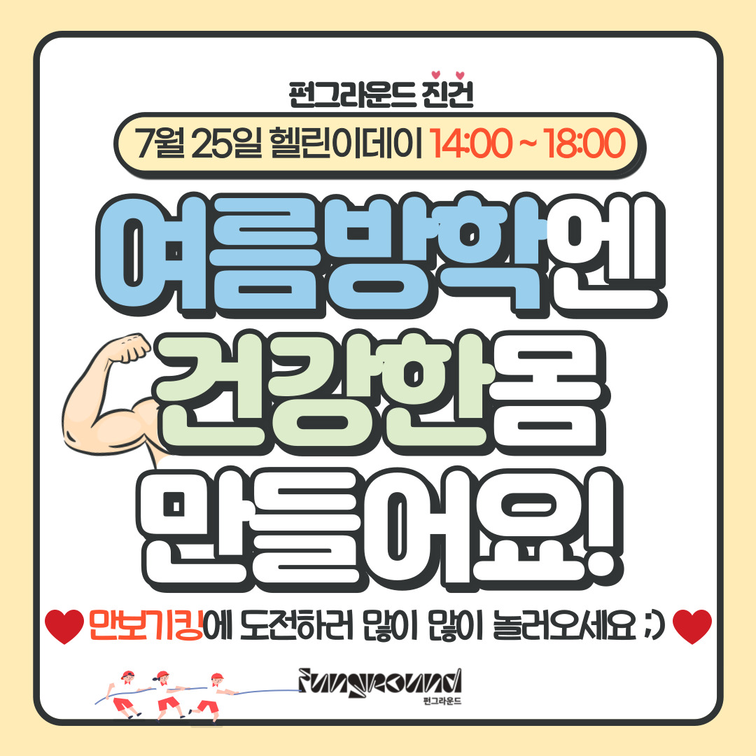 진건 [펀그라운드 진건] 헬린이데이 안내 작성자 펀그라운드진건 등록일자 2023년 7월 23일 11시 36분 20초 조회 396 펀그라운드 진건이번 여름방학엔 펀그라운드 진건에서 건강한 몸을 만들어보아요!- 7월 25일(화) 14:00 ~ 18:00 헬린이데이펀그라운드 진건에서는 헬린이데이를 맞이하여 만보기킹을 찾고있습니다!만보기를 1분동안 가장 많이 흔든 학생에게는 헬린이선물을 증정합니다! 어떤 선물일지 기대되지않나요?도전의 문은 2시부터 6시까지 활짝 열려있답니다. 펀그라운드 진건으로 도전하러 놀러오세요! 001.jpg [ Size : 166.15KB, Down : 131 ] 미리보기 다운로드 002.jpg [ Size : 194.02KB, Down : 137 ] 미리보기 다운로드 003.jpg [ Size : 276.4KB, Down : 148 ] 미리보기 다운로드 004.jpg [ Size : 213.31KB, Down : 136 ] 미리보기 다운로드 목록보기