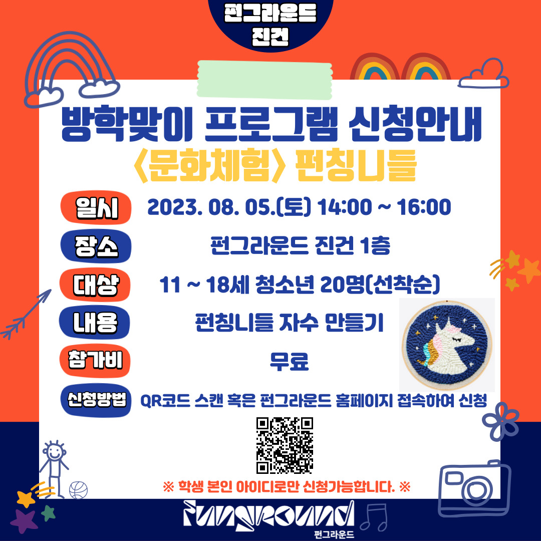 진건 [펀그라운드 진건] 문화체험 <펀칭니들자수> 안내 작성자 펀그라운드진건 등록일자 2023년 7월 26일 10시 43분 29초 조회 452 펀그라운드 진건여름방학맞이 프로그램 신청 안내드립니다!이번 문화체험은 바로 <펀칭니들 자수만들기> 입니다. - 8월 5일(토) 14:00 ~ 16:00신청은 QR코드 스캔 혹은 펀그라운드 홈페이지에서 가능합니다!*학생 본인 아이디로만 신청가능하니 유의해주시기 바랍니다! 001.jpg [ Size : 184.16KB, Down : 134 ] 미리보기 다운로드 002.jpg [ Size : 317.44KB, Down : 144 ] 미리보기 다운로드 003.jpg [ Size : 176.26KB, Down : 133 ] 미리보기 다운로드 목록보기