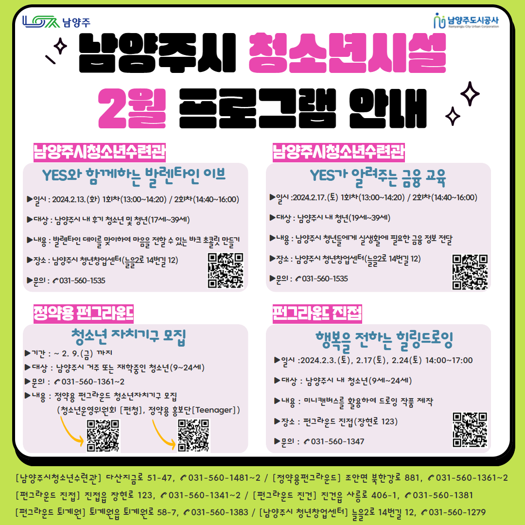 남양주시청소년수련관·정약용 펀그라운드·펀그라운드 진접·펀그라운드 진건·펀그라운드 퇴계원·남양주시 청년창업센터가 연합하여 "남양주시 청소년시설 2월 프로그램"을 안내합니다!!