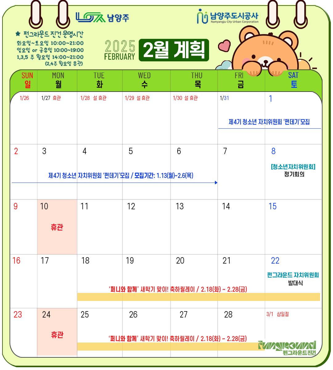 진건 [펀그라운드진건] 2025년 2월 일정을 공지합니다 작성자 펀그라운드진건 등록일자 2025년 2월 1일 18시 23분 0초 조회 273 2025-02_sns.jpg [ Size : 556.06KB, Down : 151 ] 미리보기 다운로드 목록보기