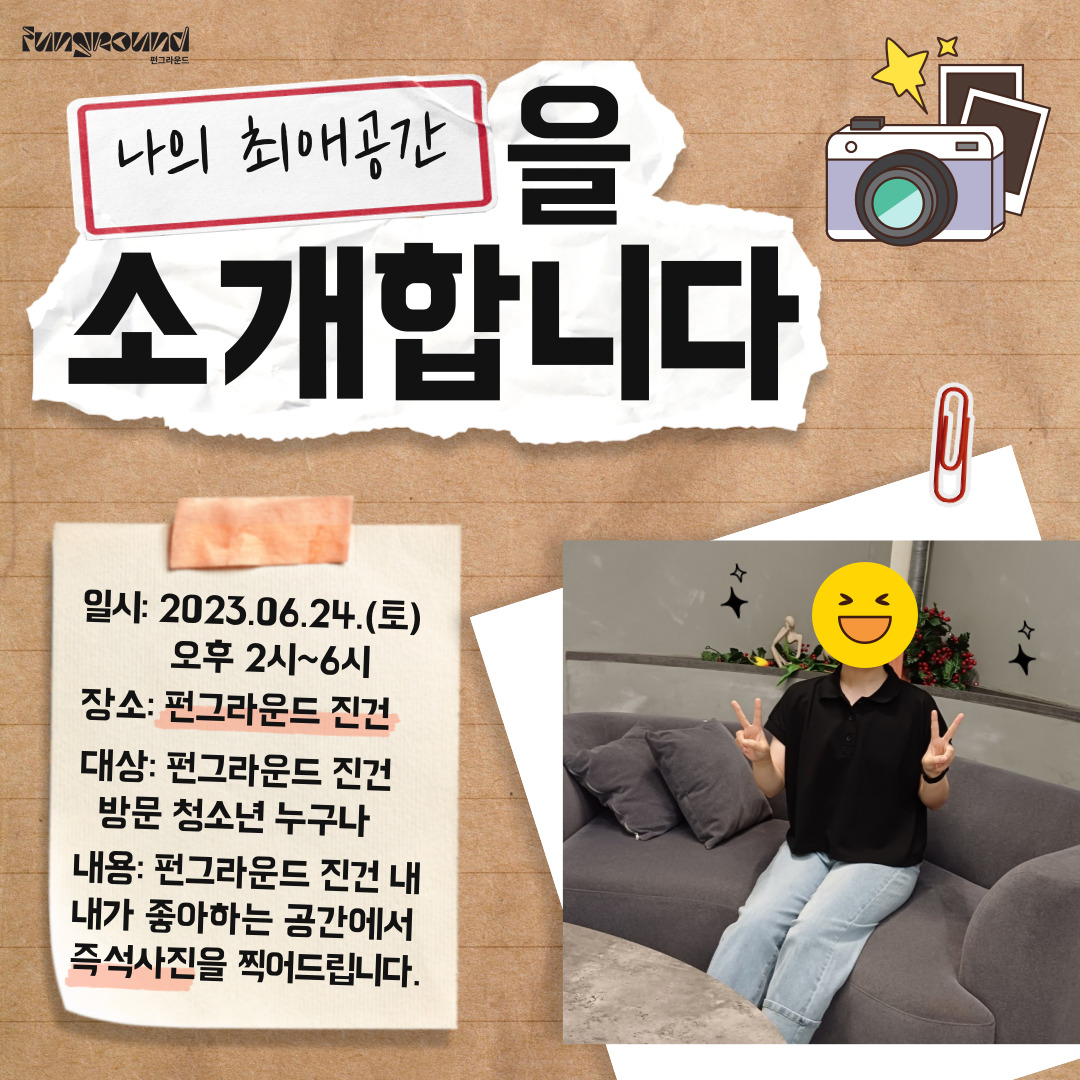 진건 [펀그라운드 진건] 6월 컨셉데이 포토데이 작성자 펀그라운드진건 등록일자 2023년 6월 21일 14시 11분 23초 조회 431 6월의 컨셉데이는 바로~~~~~<포 토 데 이> 입니다!!!이번주 토요일 오후 2시에서 6시까지펀그라운드 진건을 방문한 청소년 누구나자신이 제일 좋아하는 공간에서즉석사진을 찍을 수 있어요!당신의 최애공간은 어디인가요? 제목을-입력해주세요_-001 (4).jpg [ Size : 365.24KB, Down : 146 ] 미리보기 다운로드 목록보기