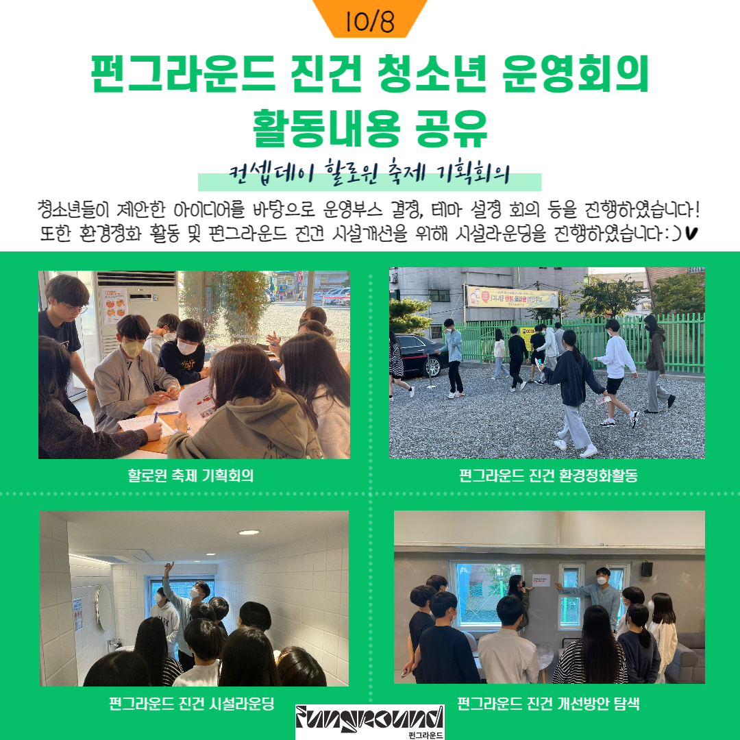 진건 [청소년 운영회의] 10월 활동 내용 공유 작성자 펀그라운드진건 등록일자 2022년 10월 15일 14시 59분 40초 조회 458 펀그라운드 진건 '청소년 운영회의' 10월 활동내용 공유!!!1. 10월 29일(토)에 진행되는 할로윈 축제 기획활동 진행!2. 펀그라운드 진건 환경정화활동!3. 펀그라운드 진건 시설라운딩 및 개선사항 점검!!펀그라운드 진건 시설 활성화를 위해 '청소년 운영위원회' 청소년들과 함께 만들어가고 있습니다:) 청소년 운영회의(1).jpg [ Size : 908.46KB, Down : 149 ] 미리보기 다운로드 목록보기
