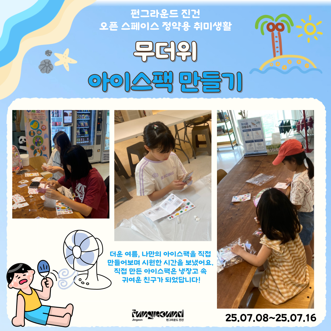 진건 [펀그라운드 진건] 7월 활동 아이스팩 만들기 작성자 펀그라운드진건 등록일자 2025년 8월 2일 15시 54분 52초 조회 46 [펀그라운드 진건] 무더위 아이스팩 만들기.png [ Size : 1.02MB, Down : 22 ] 미리보기 다운로드 목록보기