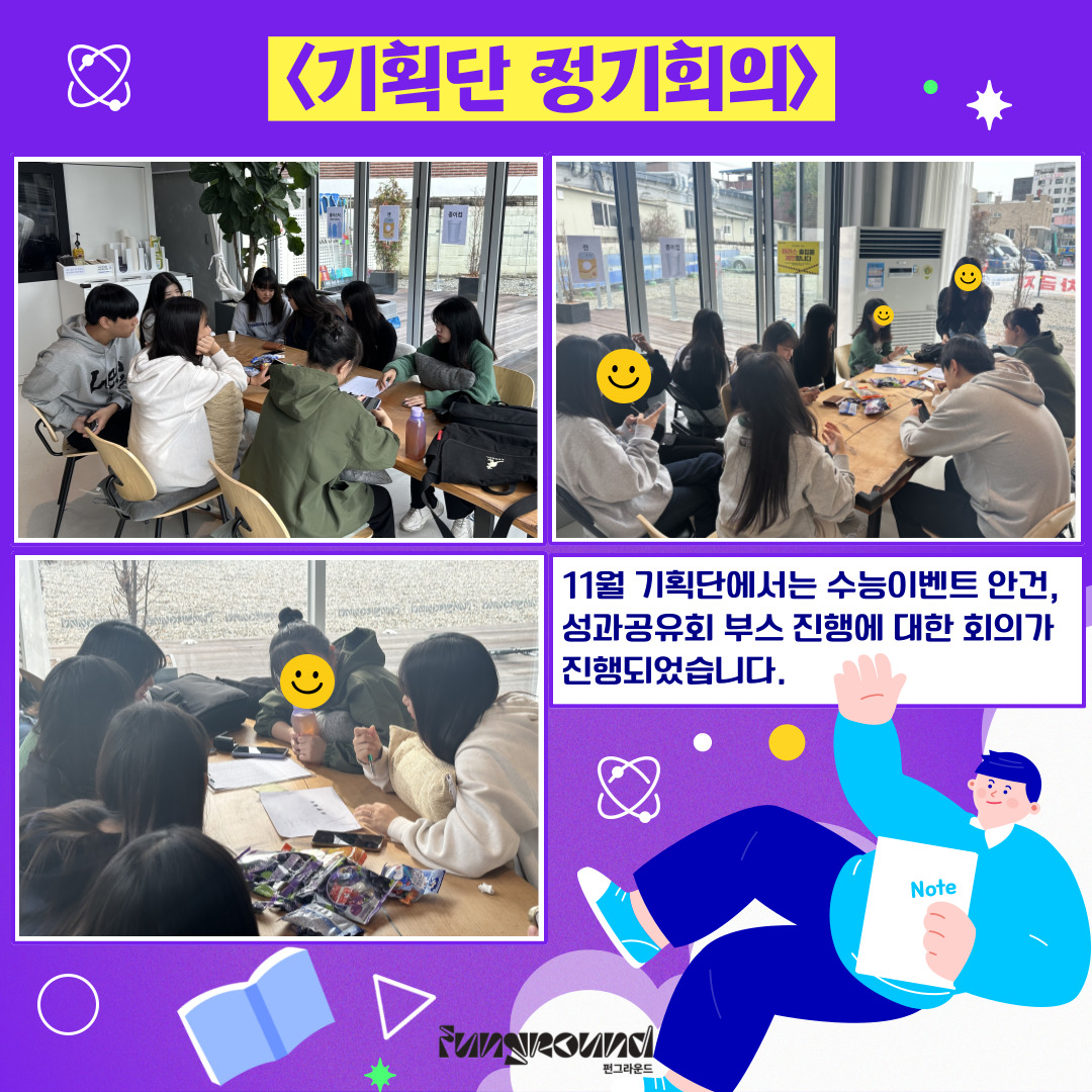 정기회의에서는 수능이벤트 안건과 성과공유회 부스 진행에 대한 안건으로 회의가 진행되었답니다!