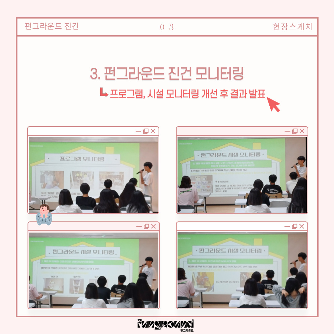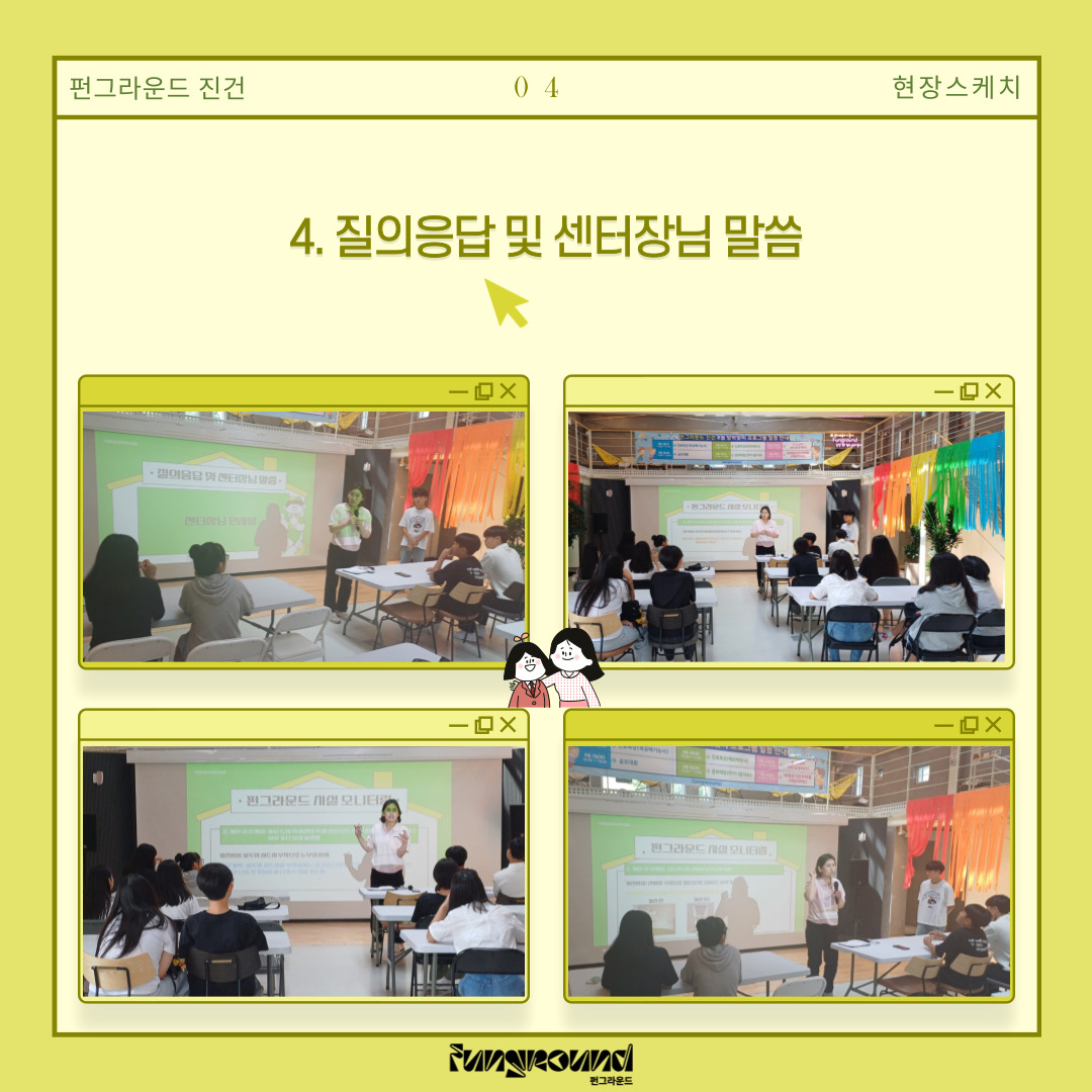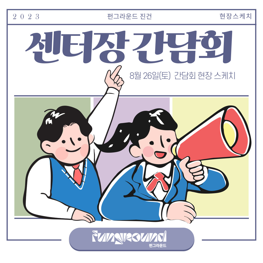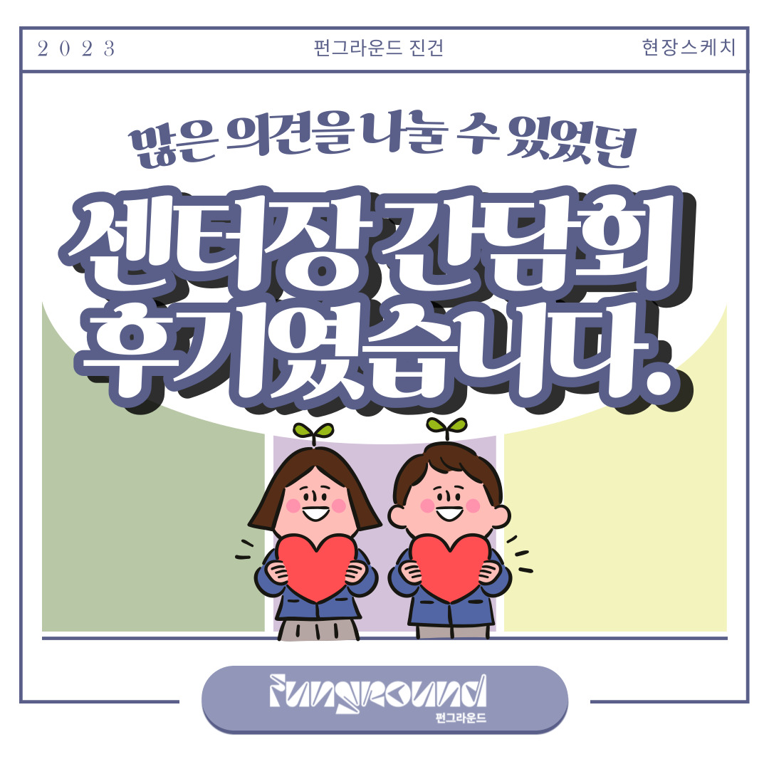센터장님과 청운위 학생들이 많은 의견을 나눌 수 있었던 소중한 시간이었습니다. 펀그라운드 진건을 한층 발전시킬 수 있었던 학생들의 건의사항들을 수렴한 후 조치한 결과보고도 볼 수 있었던 시간이었어요! 그 소중했던 현장, 함께 보시죠-