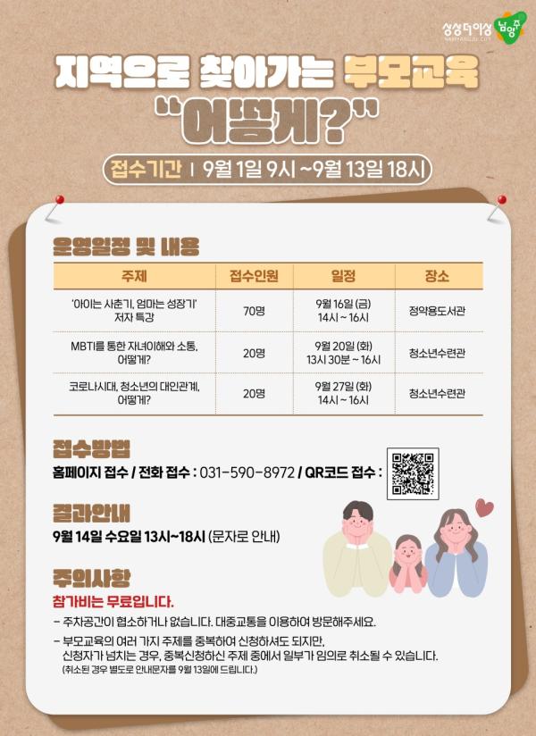 이번 부모교육이 진행되는 남양주시청소년상담복지센터 관계자는 “지역으로 찾아가는 부모교육을 통해 많은 부모님들이 교육에 참석할 수 있기를 기대하며, 부모 자신도 성장하고 자녀도 함께 성장할 수 있는 시간이 되길 바란다.”라고 말했다.