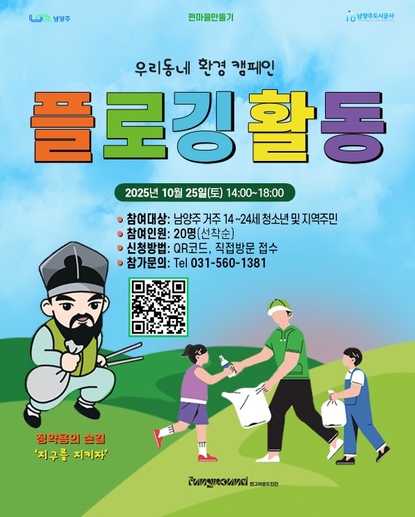 우리마을 환경 개선을 위하여 펀그라운드 진건 주변과 지역 초등학교 주변 도로 및 용정리 주변 도로를 중심으로 환경개선 쓰레기를 줍고 정약용의 손길 '지구를 지키자' 환경 캠페인 활동을 인지하는 프로그램이 될 수 있도록 함. |