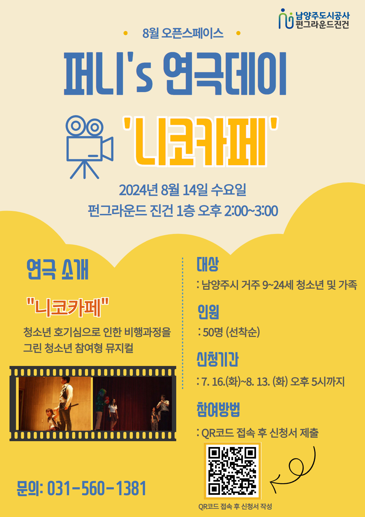 8월 오픈스페이스 퍼니's 연극데이 「니코카페」 대상: 9~24세 청소년 및 가족 인원: 50명 *선착순 신청 기간: 7.16.(화)~7.19.(금) 오후 5시까지 참여방법: QR코드 접속 후 신청서 작성 |