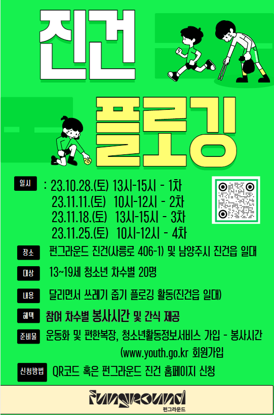 남양주시 진건읍 환경정화활동으로 달리면서 쓰레기를 줍는 봉사활동 입니다. 청소년활동정보서비스(www.youth.go.kr) 회원가입을 해주셔야 정보를 토대로 봉사시간 입력이 가능하니 확인해주세요 |