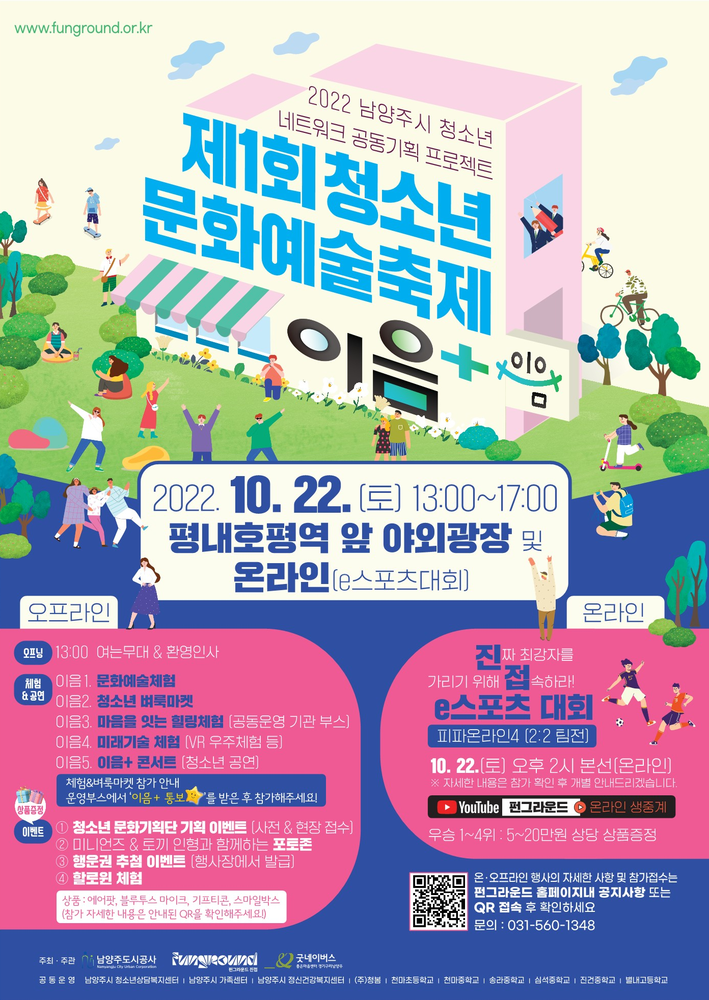 남양주도시공사(사장 신동민)가 수탁 운영중인 펀그라운드 진접은 구리남양주교육지원청 등 13개 청소년 유관기관들과 협업하여 10월 22일 오후 1시부터 5시까지 평내호평역 야외광장과 온라인에서 제1회 청소년문화예술축제 이음+를 개최한다고 밝혔다.