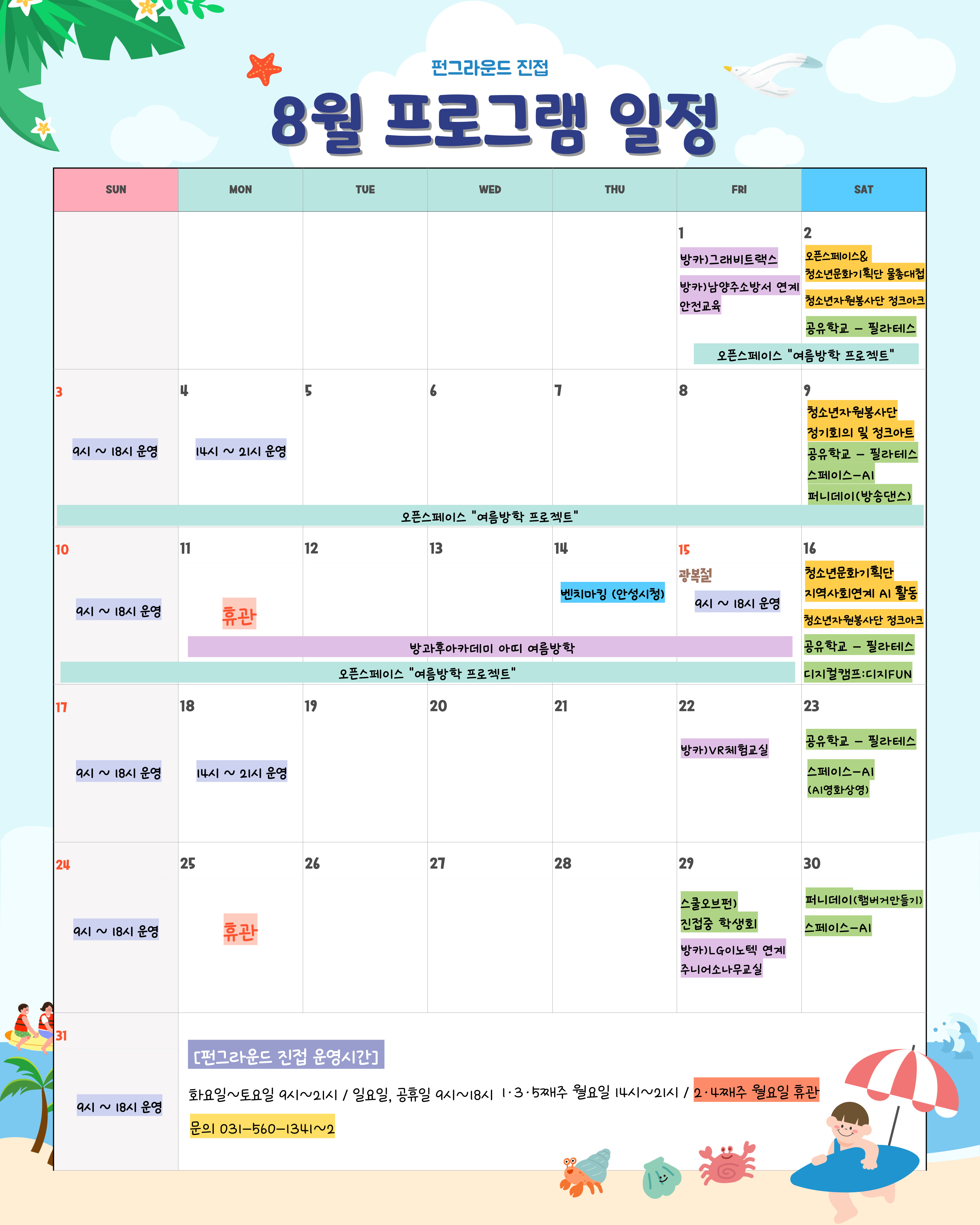 진접 [공지] 펀그라운드 진접 8월 일정 작성자 펀그라운드진접 등록일자 2025년 7월 30일 18시 57분 20초 조회 295 8월에도 FUN하게!뜨거운 여름 펀그라운드진접에서 시원하게 즐겨볼까요 다양한 프로그램이 준비되어있다구요!친구들과 함께 특별한 추억을 만들기 딱 좋은‼️ 펀진접으로 놀러오세요 8월-일정표-001.jpg [ Size : 1.13MB, Down : 297 ] 미리보기 다운로드 목록보기