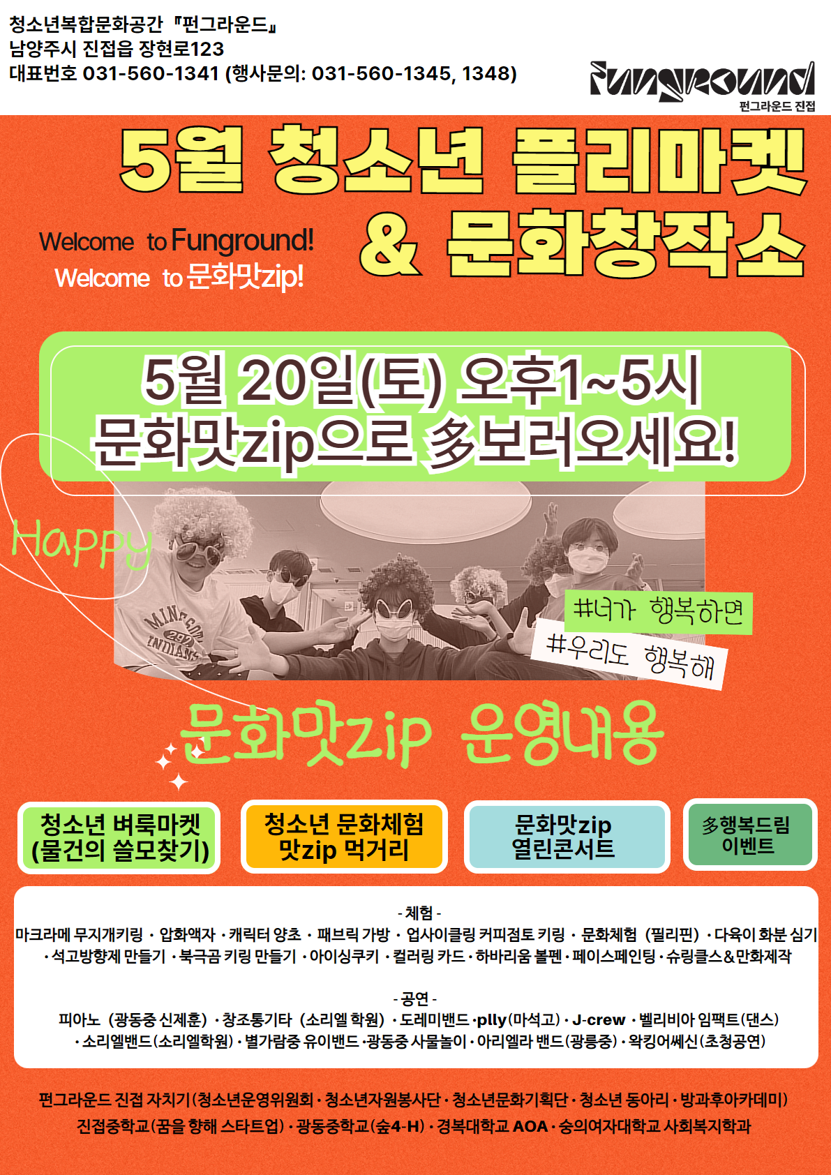 진접 [진접] 5월20일 플리마켓 오픈!!! (문화맛zip으로 多보러오세요!) 작성자 펀그라운드진접 등록일자 2023년 4월 28일 9시 44분 10초 조회 6,196 5월 펀그라운드 진접에서 함께 즐겨요!! (온가족 참여 가능한 플리마켓&문화창작 공연)주요내용: 벼룩마켓(쓸모찾기), 체험부스, 이벤트(多행복존),열린콘서트가 진행됩니다!! 토요일 펀그라운드 진접으로 놀러오세요~~!! 문의: 펀그라운드 진접 031-560-1348 -체험- 마크라메 무지개키링, 하바리움 볼펜, 아이싱쿠키, 압화액자, 캐릭터 양초 만들기, 컬러링 카드, 북극곰 키링 만들기, 업사이클링 커피점토키링 만들기, 문화체험(필리핀), 다육이심기, 석고방향제 만들기, 페이스페인팅, 풍선아트, 행복사진관, 행복노래방 플리마켓 포스터.png [ Size : 2.01MB, Down : 145 ] 미리보기 다운로드 목록보기