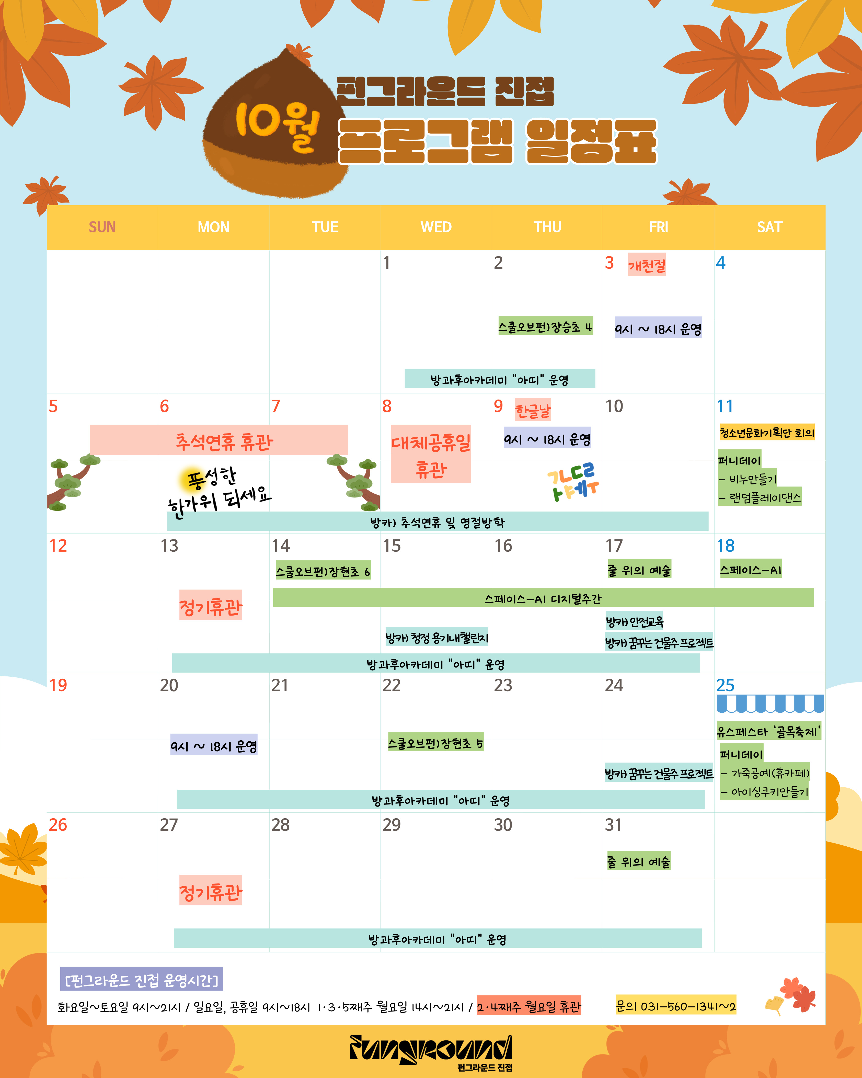 진접 [공지] 펀그라운드 진접 10월 일정 작성자 펀그라운드진접 등록일자 2025년 9월 30일 21시 55분 11초 조회 192 [펀그라운드 진접 10월 프로그램 일정표]펀진접과 함께하는 가을,다양한 활동이 여러분을 기다립니다!놓치지 말고 캘박하기! 10월-프로그램-일정표-001.jpg [ Size : 1.24MB, Down : 181 ] 미리보기 다운로드 목록보기