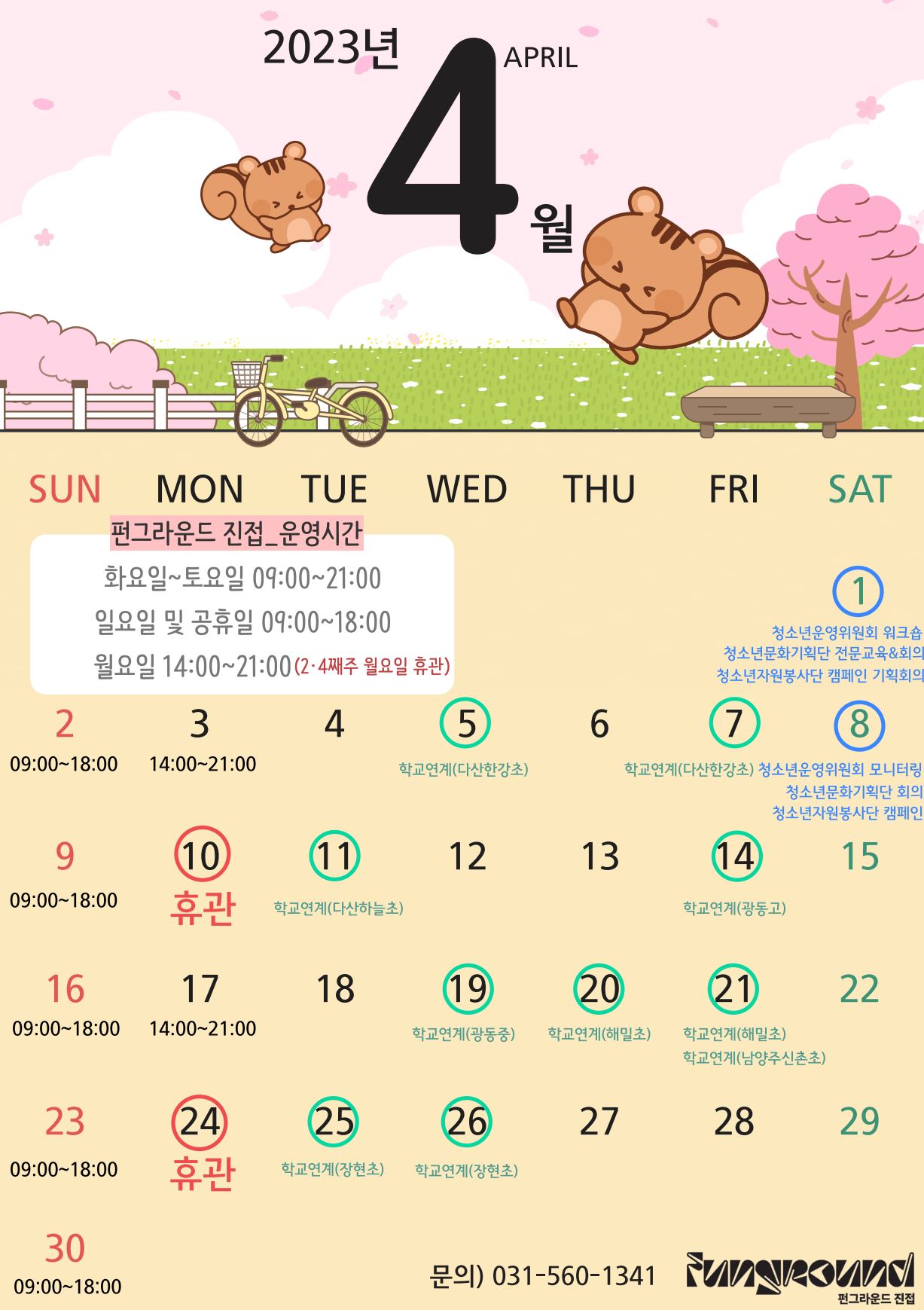 진접 [펀그라운드진접] 4월 주요일정 안내 작성자 펀그라운드진접 등록일자 2023년 4월 12일 13시 48분 33초 조회 547 펀그라운드 진접의 4월 주요일정을 안내드립니다! 4/1(토)청소년운영위원회 워크숍청소년문화기획단 전문교육&회의청소년자원봉사단 캠페인 기획회의4/8(토)청소년운영위원회 모니터링청소년문화기획단 회의청소년자원봉사단 캠페인 4/5(수)~4/26(수) 에는 학교연계 프로그램(나 더하기 프로젝트, 드림Up)가 예정중에 있습니다. ※10일, 24일은 휴관입니다.※ 프로그램들의 자세한 내용은 펀그라운드 홈페이지, 인스타그램, 페이스북, 네이버 블로그를 참고해주세요~문의)031-560-1386 4월달력.JPG [ Size : 214.04KB, Down : 4,325 ] 미리보기 다운로드 목록보기