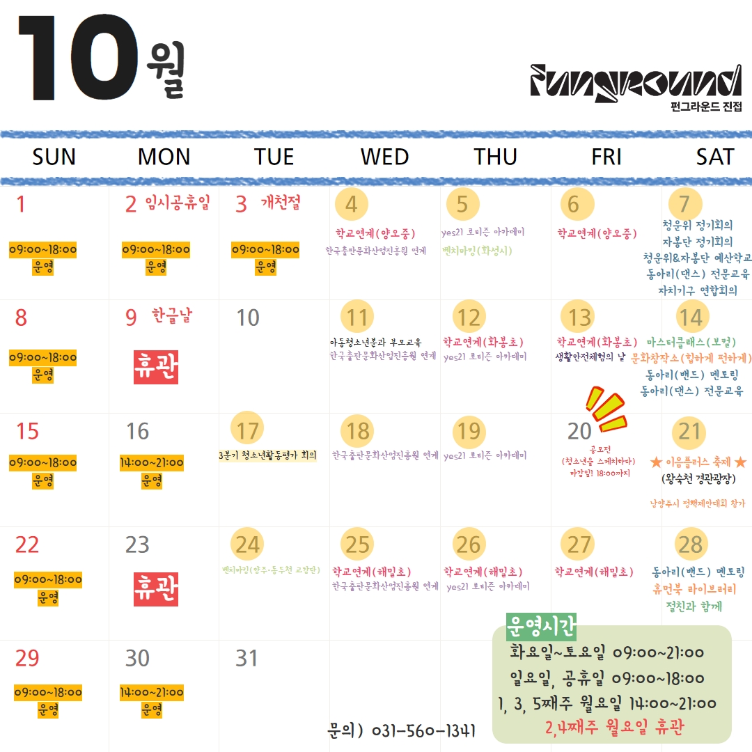 진접 [펀그라운드 진접] 10월 일정 안내 작성자 펀그라운드진접 등록일자 2023년 9월 27일 17시 35분 9초 조회 370 10월 일정표 (3).jpg [ Size : 427.46KB, Down : 155 ] 미리보기 다운로드 목록보기