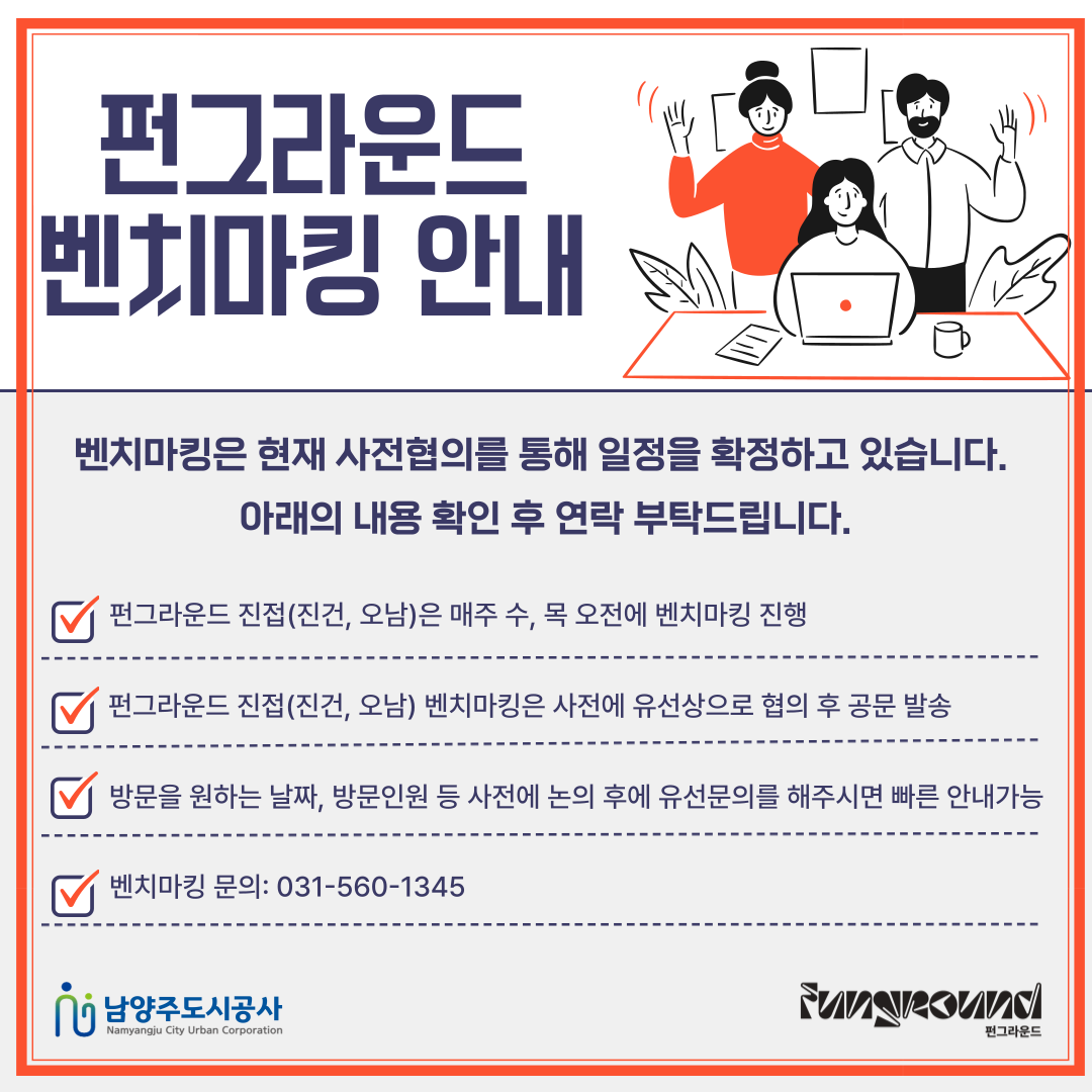 공지 진접 [공지] 2025년 벤치마킹 안내 작성자 펀그라운드진접 등록일자 2025년 1월 7일 10시 23분 59초 조회 299 안녕하세요 펀그라운드 진접입니다.펀그라운드에 지속적인 관심을 보여주셔서 감사합니다. 개관 이후 청소년 사업 다양화와 더불어 청소년 이용률이 꾸준히 증가하고 있어벤치마킹 일정은 사전 협의를 통해 확정하고 있으니, 양해부탁드립니다.☎문의 031-560-1345 제목을-입력해주세요_-001 (2).png [ Size : 203.79KB, Down : 116 ] 미리보기 다운로드 목록보기