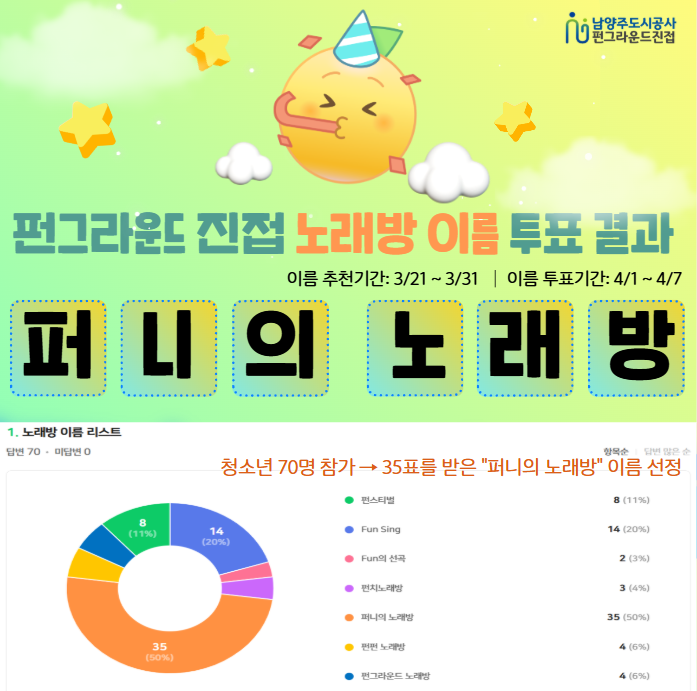 진접 [공유] 펀그라운드 진접 노래방 이름 투표 결과 공유 ! 작성자 펀그라운드진접 등록일자 2025년 4월 8일 16시 38분 52초 조회 235 펀그라운드 진접노래방 이름 투표 결과를 공유합니다!..70명의 청소년들이 투표해서 선정된 노래방 이름은 "퍼니의 노래방" ♬..청소년의 의견으로 만들어지고 운영되는 펀그라운드 진접 앞으로도 많.관.부. 펀진접 노래방 이름 선정 결과.png [ Size : 275.39KB, Down : 91 ] 미리보기 다운로드 목록보기