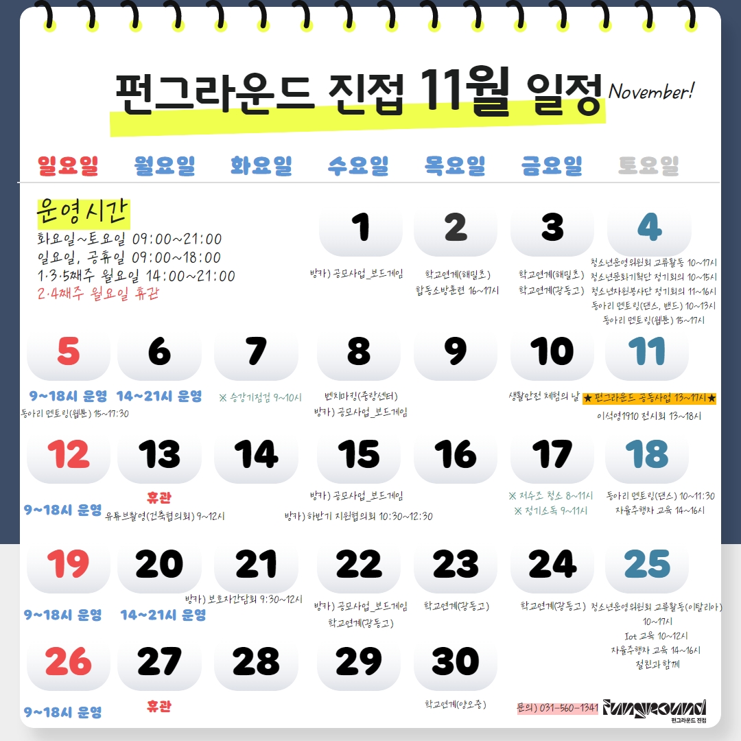 진접 [펀그라운드 진접] 11월 일정 안내 작성자 펀그라운드진접 등록일자 2023년 11월 2일 10시 48분 8초 조회 391 펀그라운드 진접 11월 일정 안내<11월 주요행사>- 자치기구 정기회의(첫째 주 토요일)- 펀그라운드 공동사업(11월 11일 토요일)- 학교연계- 청소년운영위원회 국제교류(이탈리아) 제목을 입력하세요 (3).jpg [ Size : 453.32KB, Down : 234 ] 미리보기 다운로드 목록보기