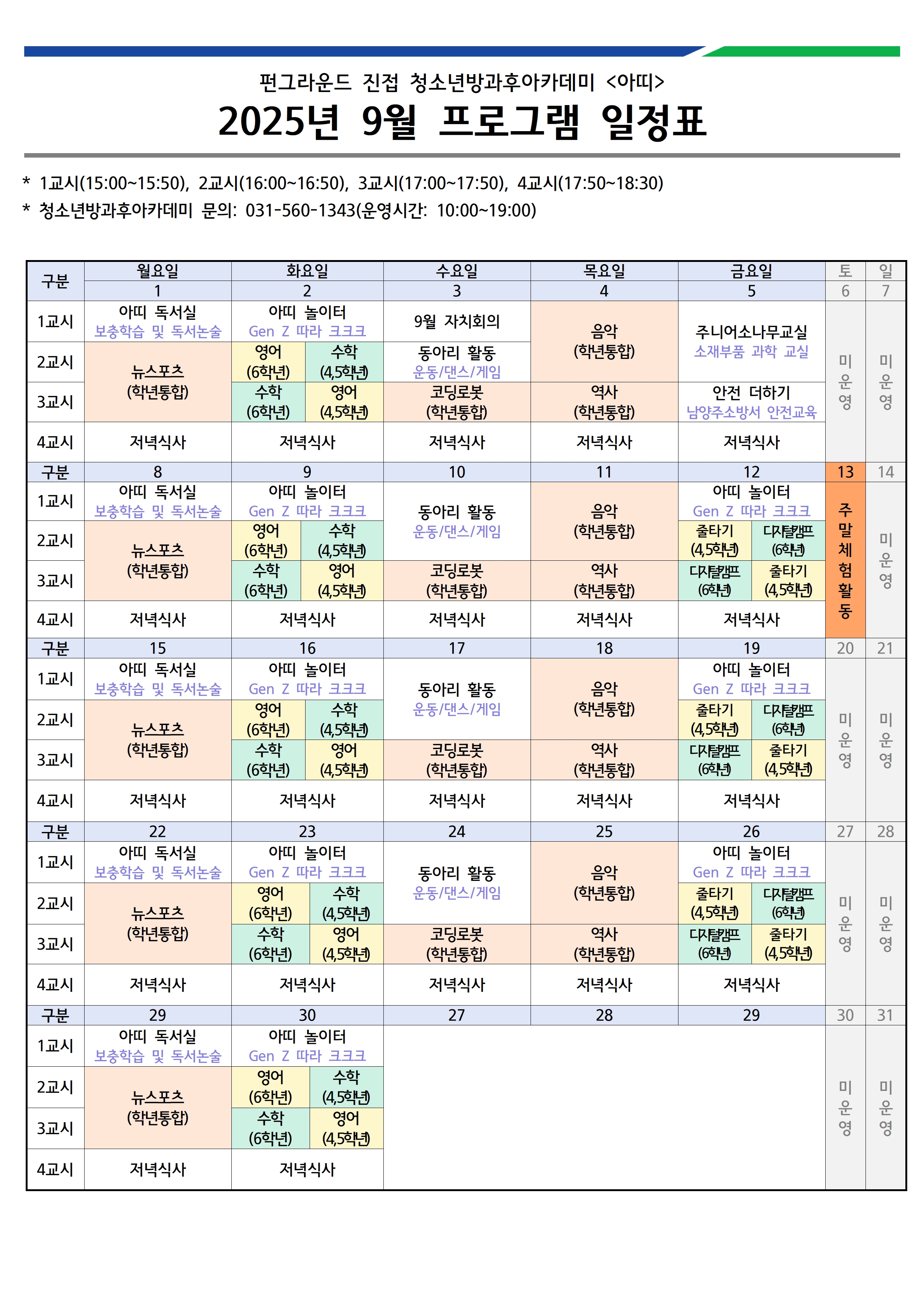 진접 [공지] 펀그라운드 진접 청소년방과후아카데미 "아띠" 9월 프로그램 일정