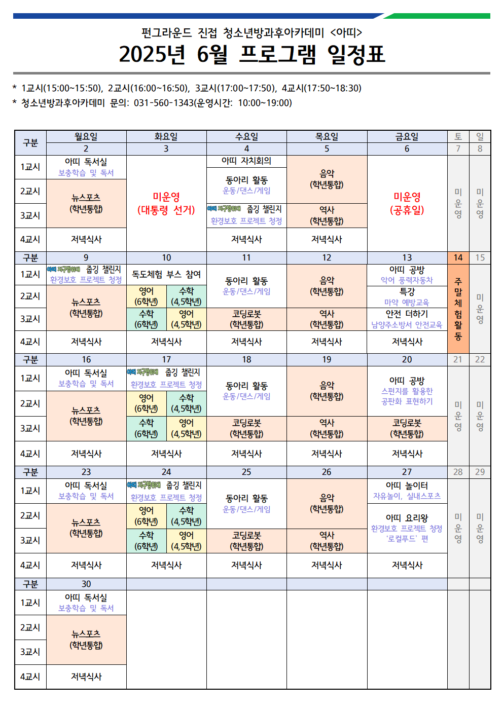 진접 [공지] 펀그라운드 진접 청소년방과후아카데미 "아띠" 6월 프로그램 일정